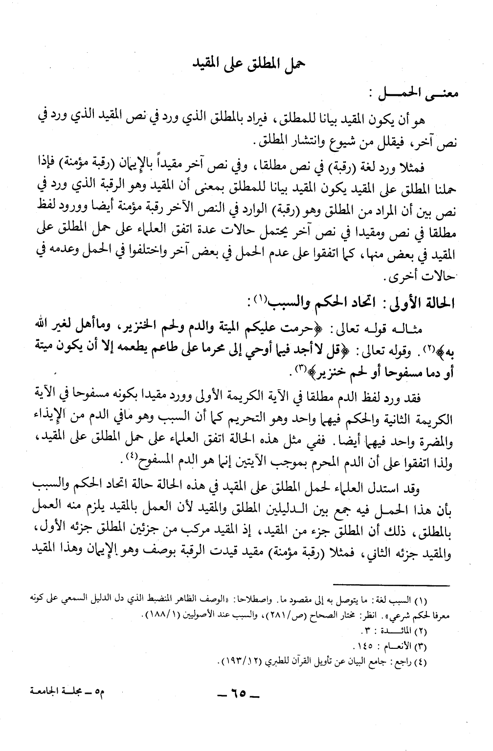 فقد ورد لفظ الدّم مطلقا في الآية الكريمة الأولى وورد مقيدا بكونه مسفوحا في الآية الكريمة الثانية والحكم فيهما واحد وهو التحريم كما أن السبب وهو ما في الدم من الإيذاء والمضرة واحد فيهما أيضا. ففي مثل هذه الحالة اتفق العلماء على حمل المطلق على المقيد، ولذا اتفقوا على أن الدم المحرم بموجب الآيتين إنما هو الدم المسفوح4.