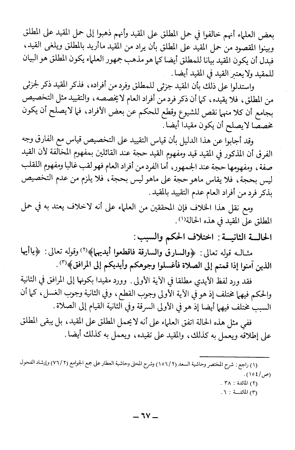فقد ورد لفظ الأيدي مطلقا في الآية الأولى. ورد مقيدا بكونها إلى المرافق في الثانية والحكم فيهما مختلف إذ هو في الآية الأولى وجوب القطع، وفي الثانية وجوب الغسل، كما أن السبب مختلف فيهما أيضا إذ هو في الأولى السرقة وفي الثانية القيام إلى الصلاة.