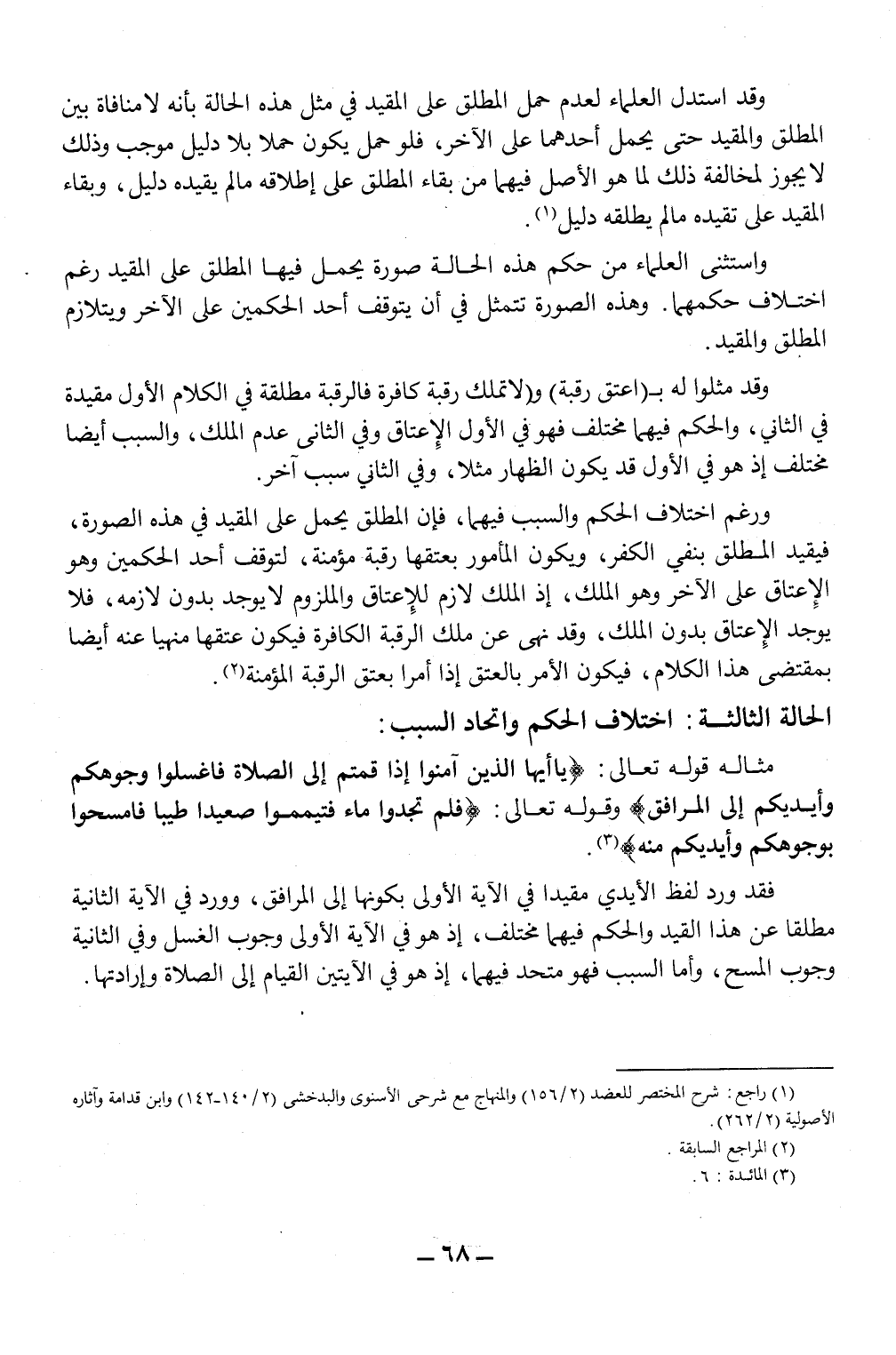 وقد مثلوا له بـ (اعتق رقبة) و (لا تملك رقبة كافرة) فالرقبة مطلقة في الكلام الأول مقيدة في الثاني، والحكم فيهما مختلف فهو في الأول الإعتاق وفي الثاني عدم الملك، والسبب أيضا مختلف إذ هو في الأول قد يكون الظهار مثلا، وفي الثاني سبب آخر.