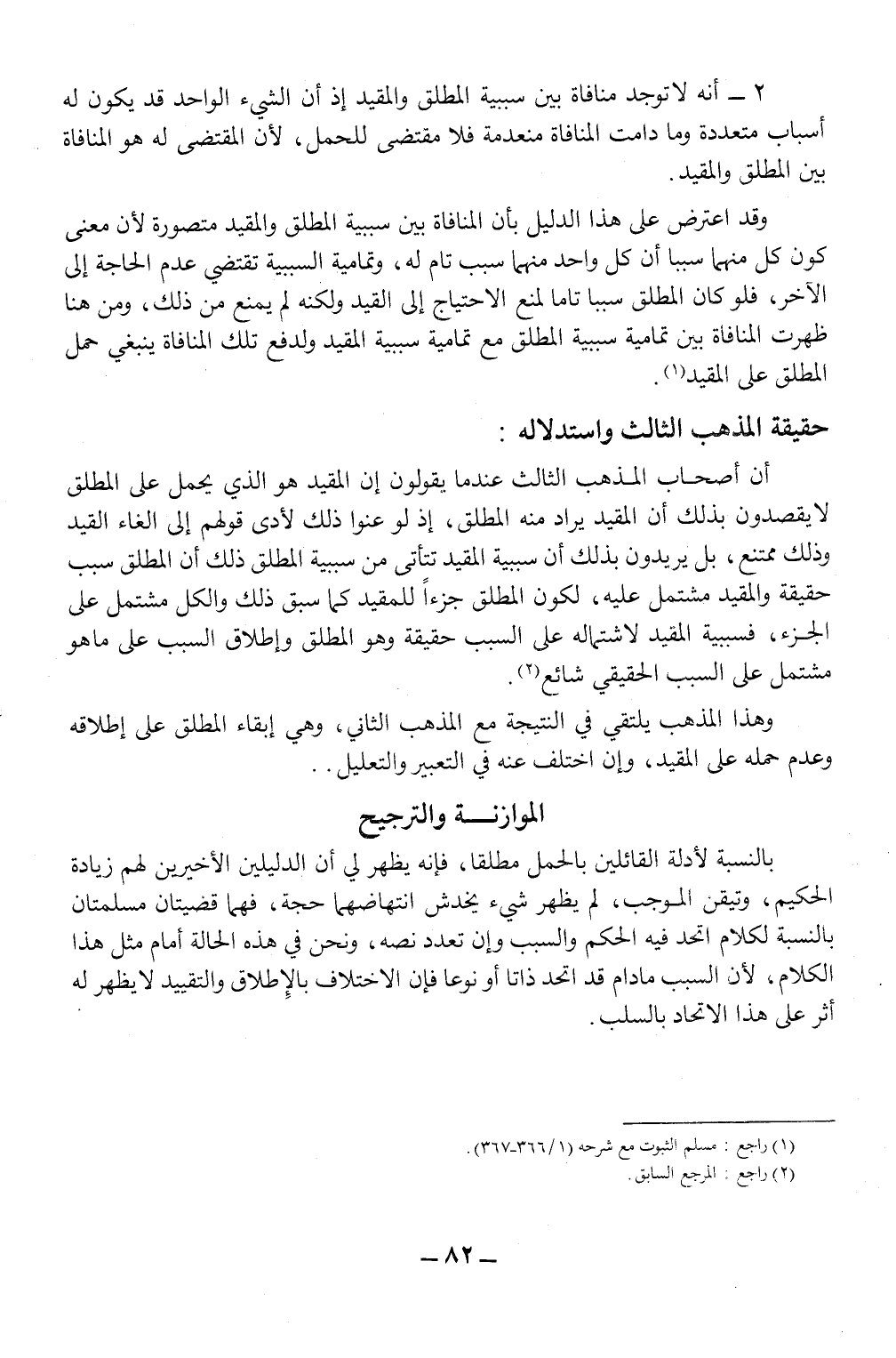 أن أصحاب المذهب الثالث عندما يقولون إن المقيد هو الذي يحمل على المطلق لا يقصدون بذلك آن المقيد يراد منه المطلق، إذ لو عنوا ذلك لأدى قولهم إلى إلغاء القيد وذلك ممتنع، بل يريدون بذلك أن سببية المقيد تتأتى من سببية المطلق ذلك أن المطلق سبب حقيقة والمقيد مشتمل عليه؛ لكون المطلق جزءاً للمقيد كما سبق ذلك والكل مشتمل على الجزء، فسببية المقيد لاشتماله على السبب حقيقة وهو المطلق وإطلاق السبب على ما هو مشتمل على السبب الحقيقي شائع2.