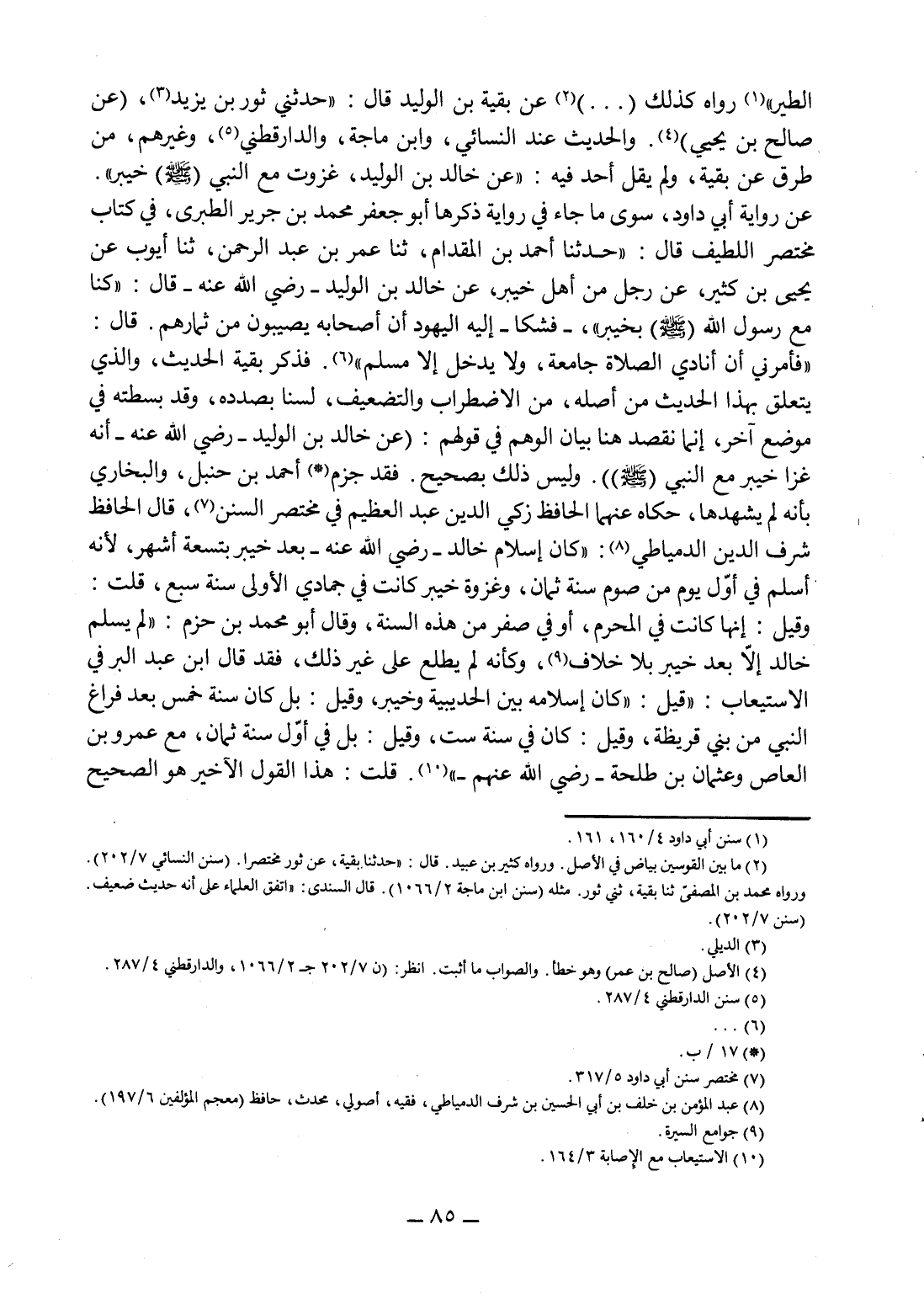 الطير" 1 رواه كذلك (000) 2 عن بقية بن الوليد قال: "حدثني ثور بن يزيد 3، (عن صالح بن يحي) 4. والحديث عند النسائي، وابن ماجة، والدارقطني 5، وغيرهم؟ من طرق عن بقية، ولم يقل أحد فيه: "عن خالد بن الوليد، غزوت مع النبي - صلى الله عليه وسلم - خيبر". عن رواية أبي داود، سوى ما جاء في رواية ذكرها أبو جعفر محمد بن جرير الطبري، في كتاب مختصر اللطيف قال: "حدثنا أحمد بن المقدام، ثنا عمر بن عبد الرحمن، ثنا أيوب عن يحيى بن كثير، عن رجل من أهل خيبر، عن خالد بن الوليد - رضي الله عنه - قال: "كنا مع رسول الله - صلى الله عليه وسلم - بخيبر"،- فشكا - إليه اليهود أن أصحابه يصيبون من ثمارهم, قال: "فأمرني أن أنادي: الصلاة جامعة، ولا يدخل إلا مسلم " 6. فذكر بقية الحديث، والذي يتعلق بهذا الحديث من أصله، من الاضطراب والتضعيف، لسنا بصدده، وقد بسطته في موضع آخر، إنما نقصد هنا بيان الوهم في قولهم: "عن خالد بن الوليد - رضي الله عنه - أنه غزا خيبر مع النبي - صلى الله عليه وسلم -", وليس ذلك بصحيح, فقد جزم 7 أحمد بن حنبل، والبخاري بأنه لم يشهدها، حكاه عنهما الحافظ زكي الدين عبد العظيم في مختصر السنن 8، قال الحافظ شرف الدين الدمياطي 9: "كان إسلام خالد - رضي الله عنه- بعد خيبر بتسعة أشهر، لأنه أسلم في أوّل يوم من صوم سنة ثمان، وغزوة خيبر كانت في جمادى الأولى سنة سبع"، قلت: وقيل: إنها كانت في المحرم، أو في صفر من هذه السنة، وقال أبو محمد بن حزم: "لم يسلم خالد إلا بعد خيبر بلا خلاف 10، وكأنه لم يطلع على غير ذلك، فقد قال ابن عبد البر في الاستيعاب: "قيل: كان إسلامه بين الحديبية وخيبر، وقيل: بل كان سنة خمس بعد فراغ النبي من بني قريظة، وقيل: كان في سنة ست، وقيل: بل في أوّل سنة ثمان، مع عمرو بن العاص وعثمان بن طلحة - رضي الله عنهم-" 11. قلت: هذا القول الأخير هو الصحيح