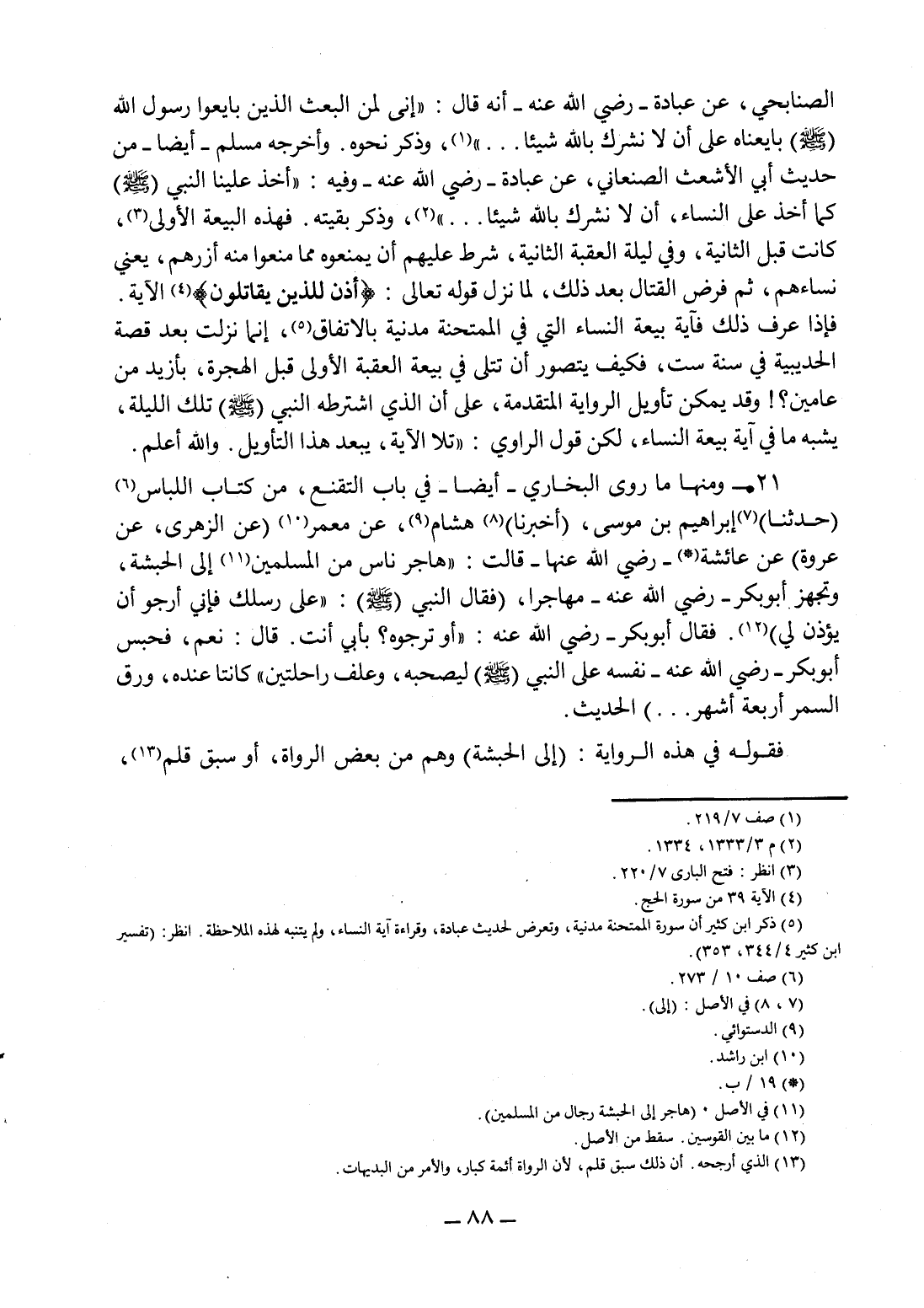 21- ومنها ما روى البخاري - أيضا - في باب التقنع، من كتاب اللباس 6 (حدثنا) 7 إبراهيم بن موسى، (أخبرنا) 8 هشام 9، عن معمر 10 (عن الزهري، عن عروة) عن عائشة 11- رضي الله عنها - قالت: "هاجر ناس من المسلمين 12 إلى الحبشة، وتجهز أبو بكر - رضي الله عنة - مهاجرا، (فقال النبي - صلى الله عليه وسلم -: "على رسلك فإني أرجو أن يؤذن لي" 13. فقال أبو بكر- رضي الله عنه -: "أو ترجوه, بأبي أنت؟ " قال: "نعم"، فحبس أبو بكر - رضي الله عنه - نفسه على النبي - صلى الله عليه وسلم - ليصحبه، وعلف راحلتين" كانتا عنده، ورق السمر أربعة أشهر…" الحديث.