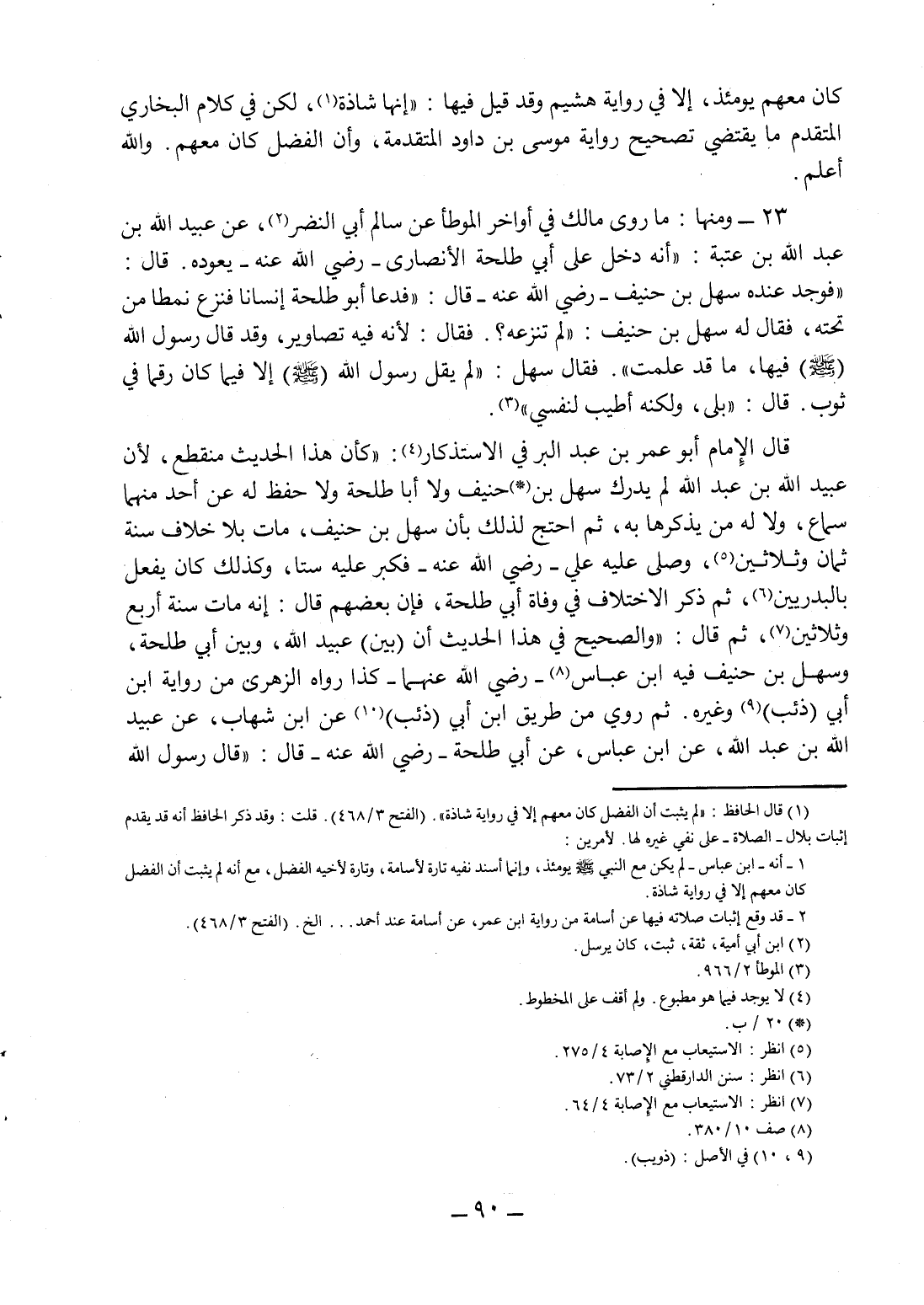قال الإمام أبو عمر بن عبد البر في الاستذكار4: "كأن هذا الحديث منقطع، لأن عبيد الله بن عبد الله لم يدرك سهل بن 5 حنيف ولا أبا طلحة ولا حفظ له عن أحد منهما سماع، ولا له من يذكرها به، ثم احتج لذلك بأن سهل بن حنيف، مات بلا خلاف سنة ثمان وثلاثين 6، وصلى عليه علي - رضي الله عنه - فكبر عليه ستا، وكذلك كان يفعل بالبدريين 7، ثم ذكر الاختلاف في وفاة أبي طلحة، فإن بعضهم قال: إنه مات سنة أربع وثلاثين 8، ثم قال: "والصحيح في هذا الحديث أن (بين) عبيد الله، وبين أبي طلحة، وسهل بن حنيف فيه ابن عباس 9- رضي الله عنهما - كذا رواه الزهري من رواية ابن أبي (ذئب) 10 وغيره. ثم روي من طريق ابن أبي (ذئب) 11 عن ابن شهاب، عن عبيد الله بن عبد الله، عن ابن عباس، عن أبي طلحة - رضي الله عنه - قال: "قال رسول الله
