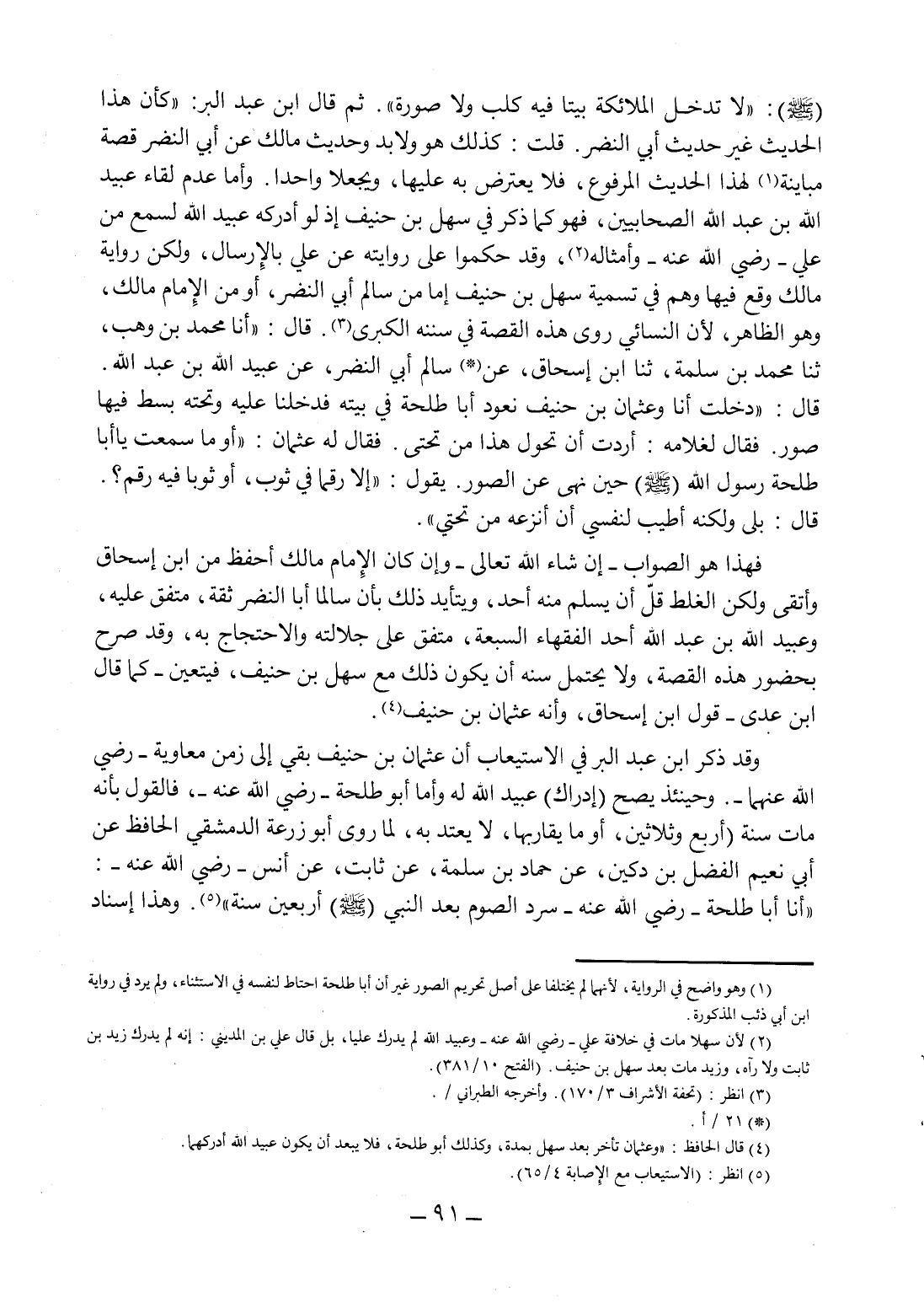- صلى الله عليه وسلم -: "لا تدخل الملائكة بيتا فيه كلب ولا صورة". ثم قال ابن عبد البر: "كأن هذا الحديث غير حديث أبي النضر". قلت: كذلك هو ولابد وحديث مالك عن أبي النضر قصة مباينة 1 لهذا الحديث المرفوع، فلا يعترض به عليها، ويجعلا واحدا. وأما عدم لقاء عبيد الله بن عبد الله الصحابيين، فهو كما ذكر في سهل بن حنيف إذ لو أدركه عبيد الله لسمع من علي - رضي الله عنه - وأمثاله 2، وقد حكموا على روايته عن علي بالإرسال، ولكن رواية مالك وقع فيها وهم في تسمية سهل بن حنيف إما من سالم أبي النضر، أومن الإمام مالك، وهو الظاهر، لأن النسائي روى هذه القصة في سننه الكبرى 3, قال: أنا محمد بن وهب، ثنا محمد بن سلمة، ثنا ابن إسحاق، عن 4 سالم أبي النضر، عن عبيد الله بن عبد الله قال: "دخلت أنا وعثمان بن حنيف نعود أبا طلحة في بيته فدخلنا عليه وتحته بسط فيها صور, فقال لغلامه: أردت أن تحول هذا من تحتي. فقال له عثمان: "أو ما سمعت يا أبا طلحة رسول الله - صلى الله عليه وسلم - حين نهى عن الصور. يقول: "إلا رقما في ثوب، أو ثوبا فيه رقم؟ قال: بلى, ولكنه أطيب لنفسي أن أنزعه من تحتي ".