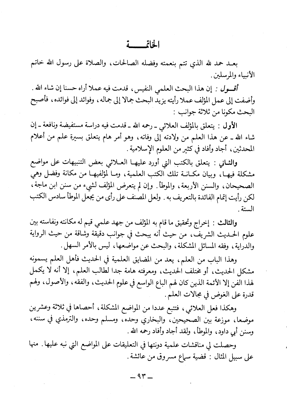 الأول: يتعلق بالمؤلف العلائي- رحمه الله - قدمت فيه دراسة مستفيضة ونافعة - إن شاء الله - عن هذا العلم من ولادته إلى وفاته، وهو أمر هام يتعلق بسيرة علم من أعلام المحدثين، أجاد وأفاد في كثير من العلوم الإسلامية.