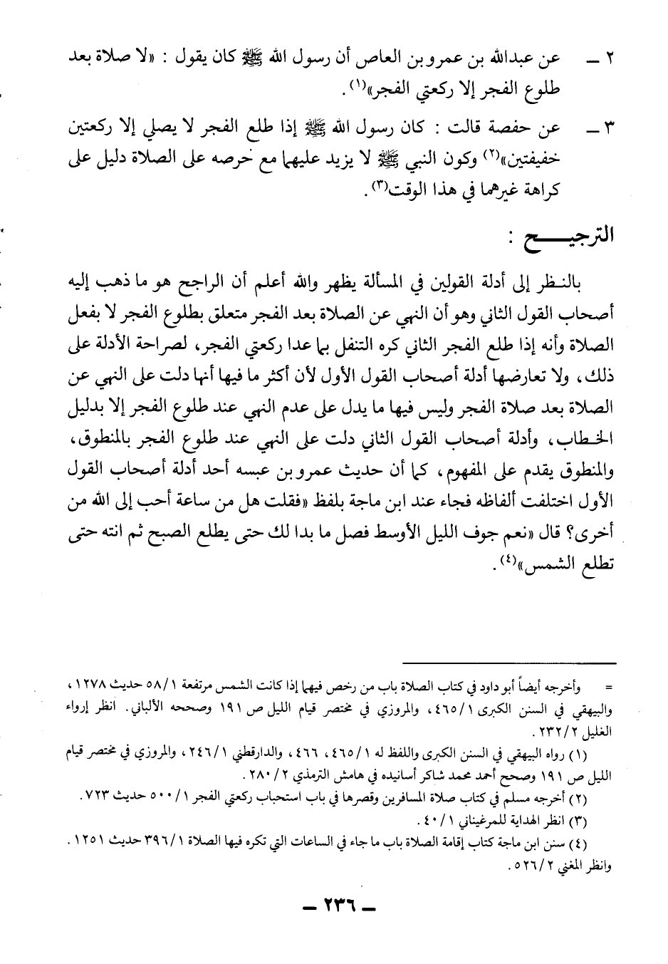 2- عن عبد الله بن عمرو بن العاص أن رسول الله صلى الله عليه وسلم كان يقول: "لا صلاة بعد طلوع الفجر إلا ركعتي الفجر" 1.
