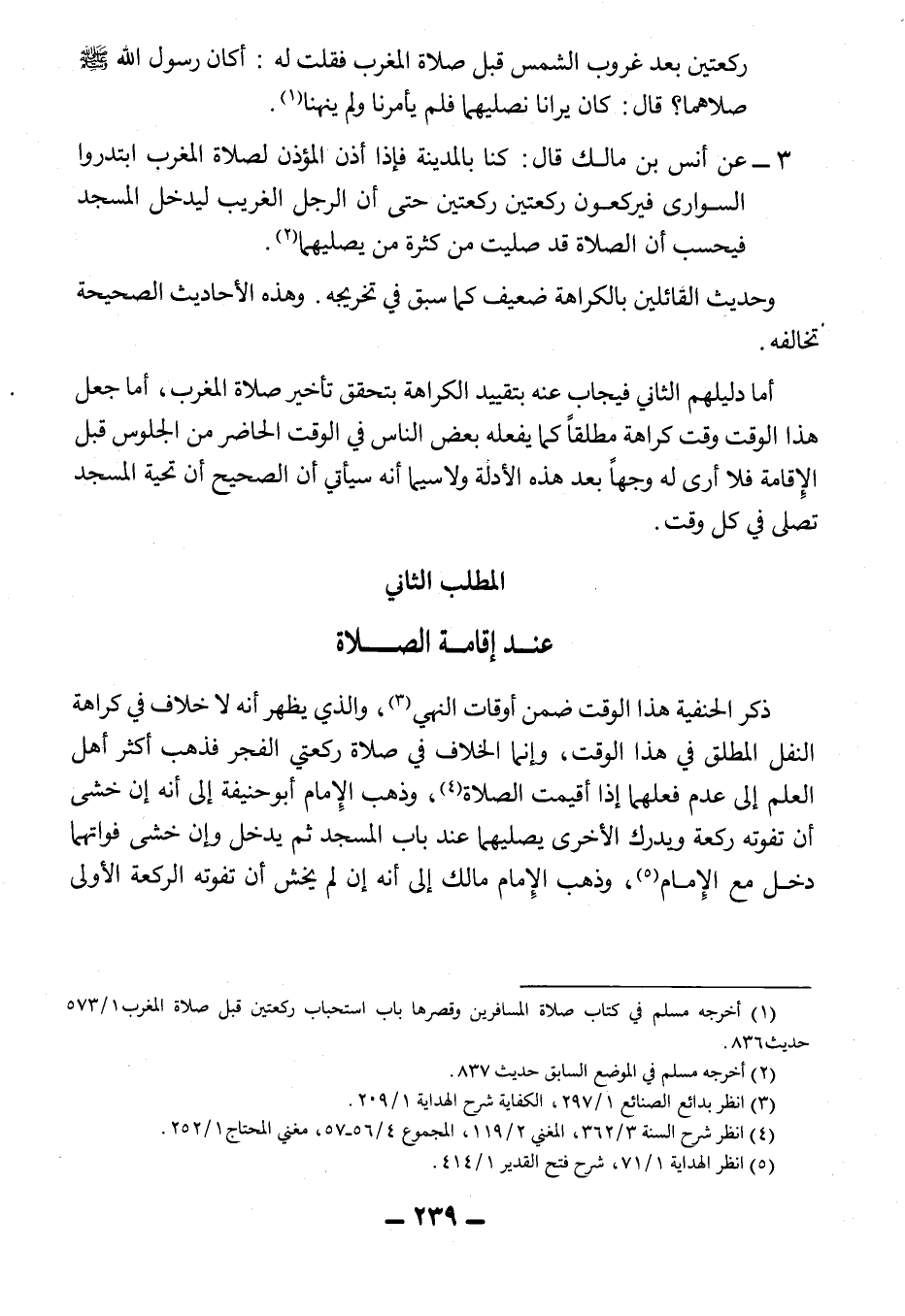 أما دليلهم الثاني فيجاب عنه بتقييد الكراهة بتحقق تأخير صلاة المغرب، أما جعل هذا الوقت وقت كراهة مطلقا كما يفعله بعض الناس في الوقت الحاضر من الجلوس قبل الإقامة فلا أرى له وجها بعد هذه الأدلة ولاسيما أنه سيأتي أن الصحيح أن تحية المسجد تصلى في كل وقت.