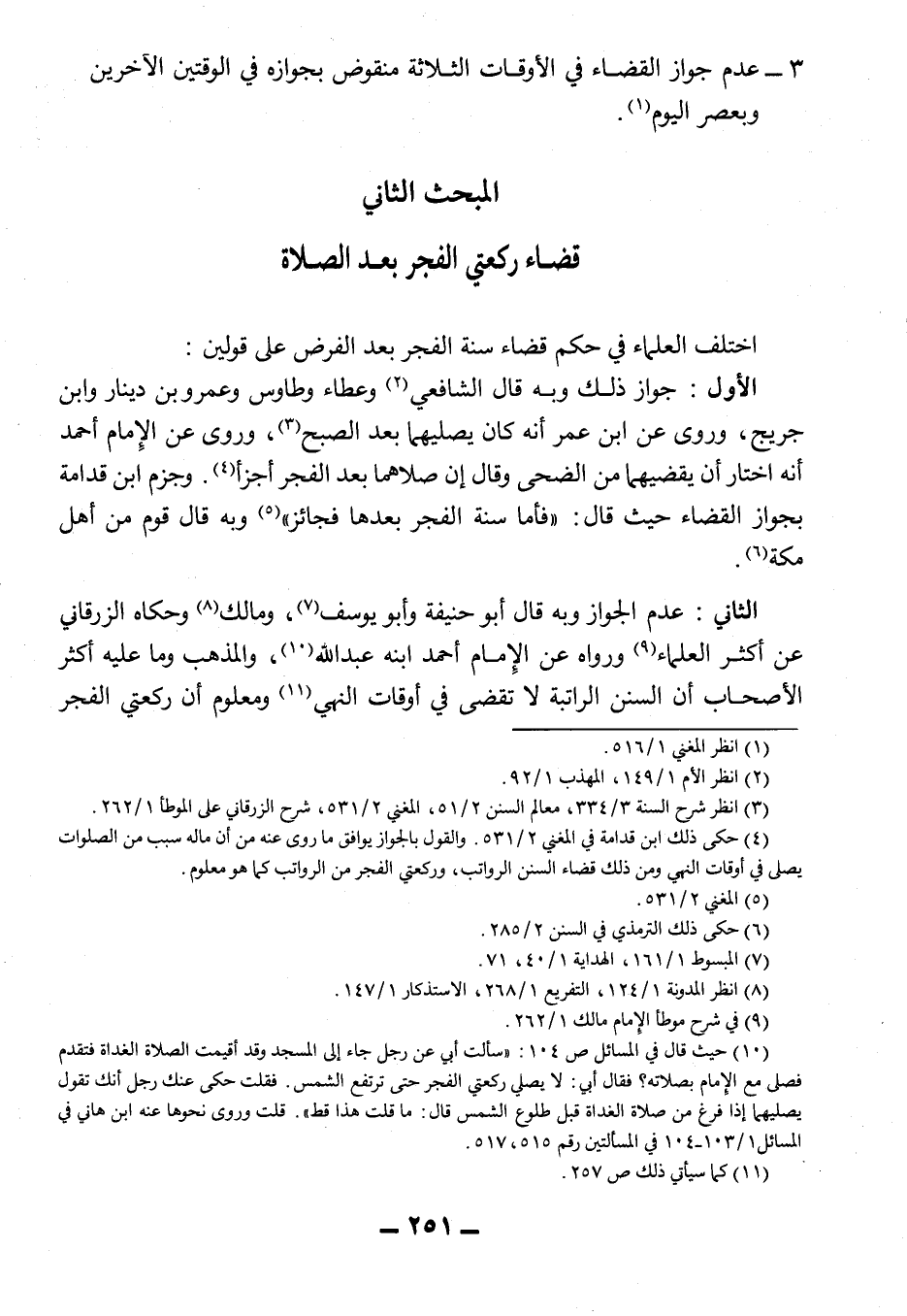 10 حيث قال في المسائل ص 104:أسألت أبي عن رجل جاء إلى المسجد وقد أقيمت الصلاة الغداة فتقدم فصلى مع الإمام بصلاته؟ فقال أبي:" لا يصلي ركعتي الفجر حتى ترتفع الشمس. فقلت حكى عنك رجل أنك تقول يصليهما إذا فرغ من صلاة الغداة قبل طلوع الشمس قال: ما قلت هذا قط ". قلت وروى نحوها عنه ابن هاني في المسائل 1/103-104 في المسألتين رقم 515، 517.