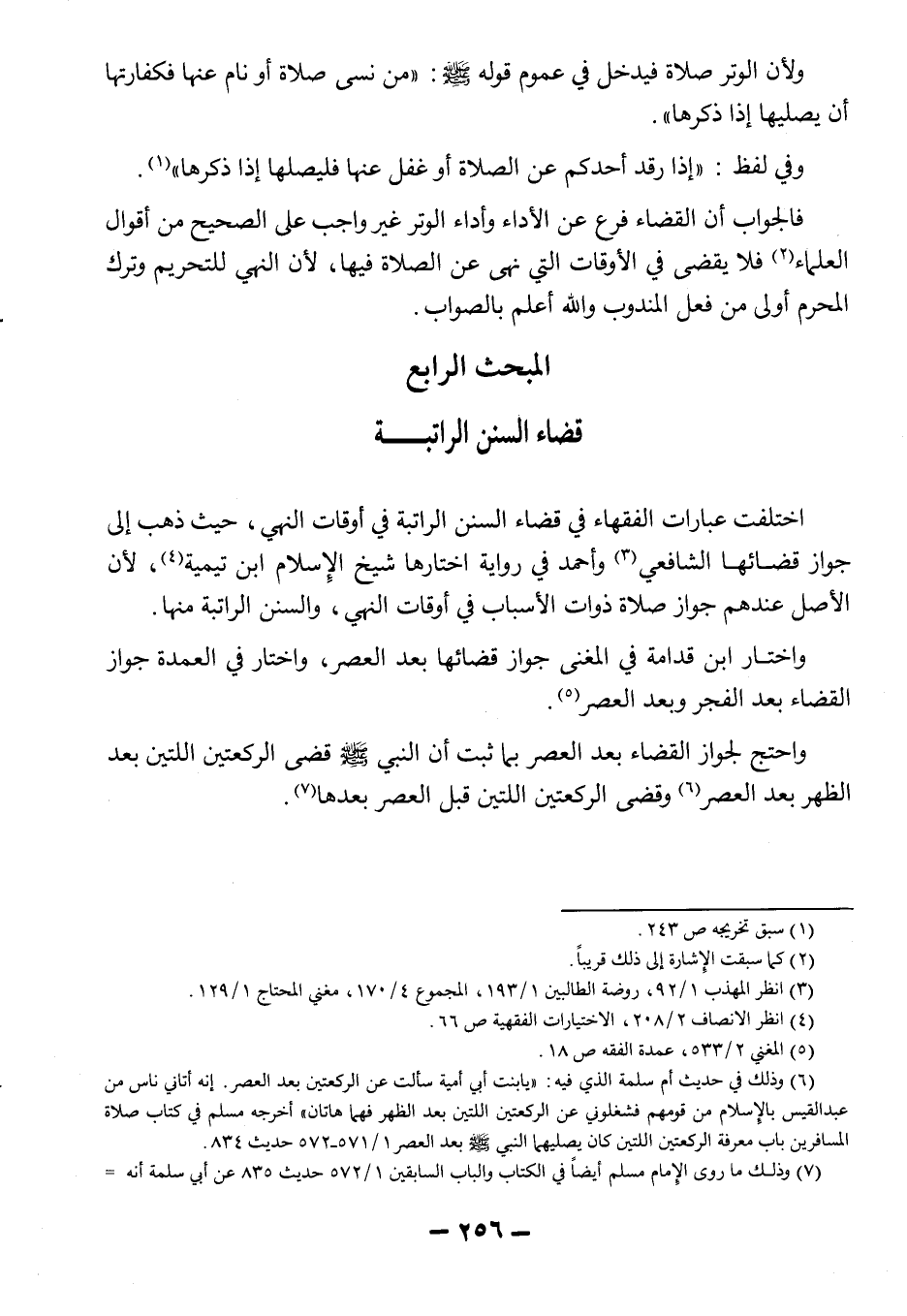 اختلفت عبارات الفقهاء في قضاء السنن الراتبة في أوقات النهي، حيث ذهب إلى جواز قضائها الشافعي3 وأحمد في رواية اختارها شيخ الإسلام ابن تيمية4، لأن الأصل عندهم جواز صلاة ذوات الأسباب في أوقات النهي، والسنن الراتبة منها. واختار ابن قدامة في المغنى جواز قضائها بعد العصر، واختار في العمدة جواز القضاء بعد الفجر وبعد العصر5.