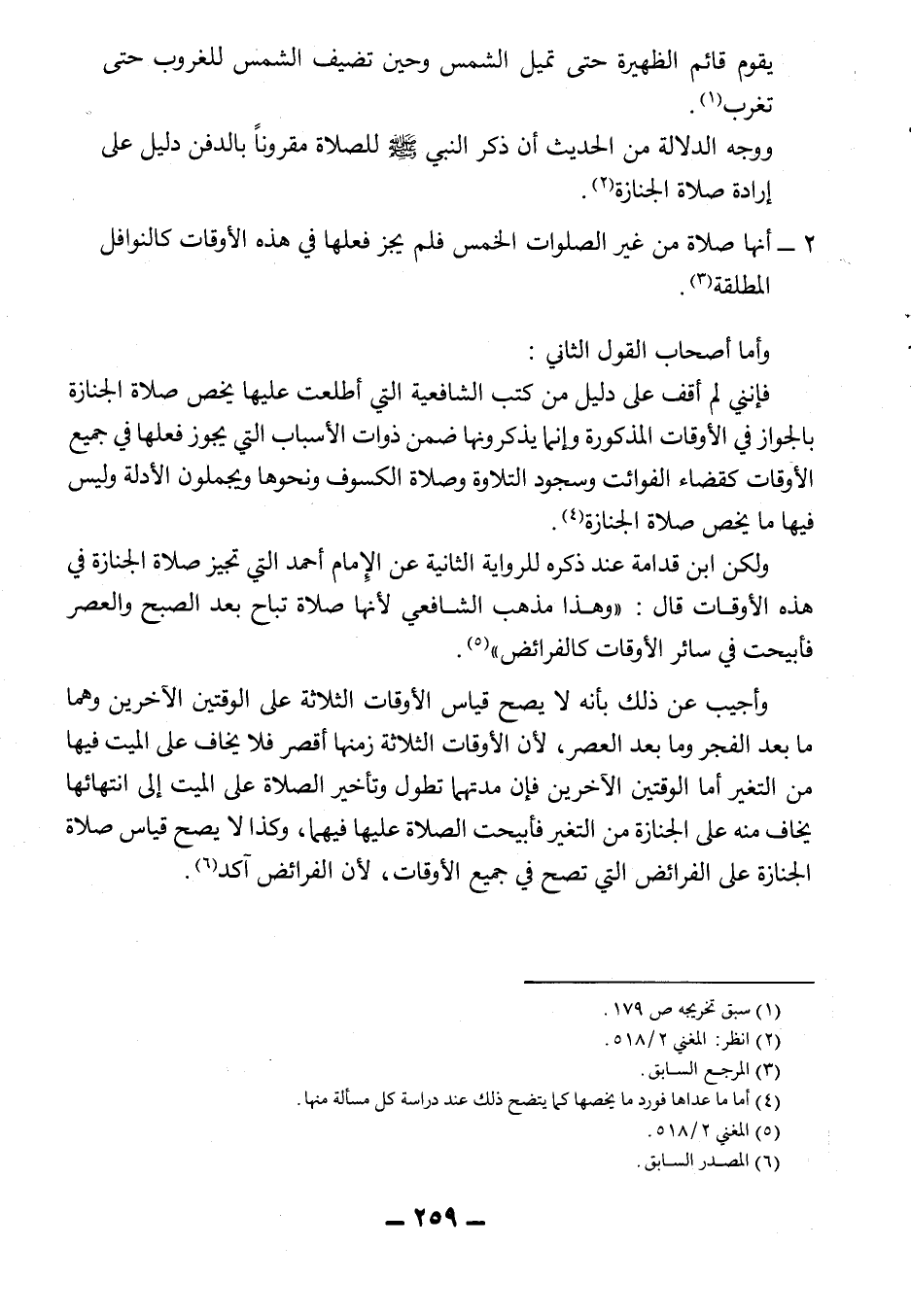 ولكن ابن قدامة عند ذكره للرواية الثانية عن الإمام أحمد التي تجيز صلاة الجنازة في هذه الأوقات قال: "وهذا مذهب الشافعي لأنها صلاة تباح بعد الصبح والعصر فأبيحت في سائر الأوقات كالفرائض "5.