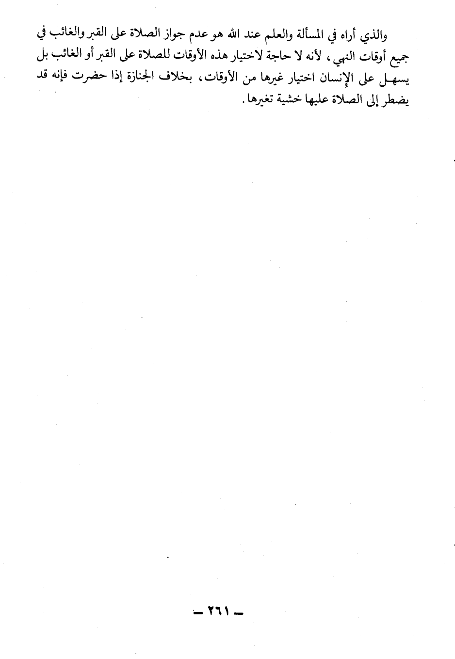 والذي أراه في المسألة والعلم عند الله هو عدم جواز الصلاة على القبر والغائب في جميع أوقات النهي، لأنه لا حاجة لاختيار هذه الأوقات للصلاة على القبر أو الغائب بل يسهل على الإنسان اختيار غيرها من الأوقات، بخلاف الجنازة إذا حضرت فإنه قد يضطر إلى الصلاة عليها خشية تغيرها.