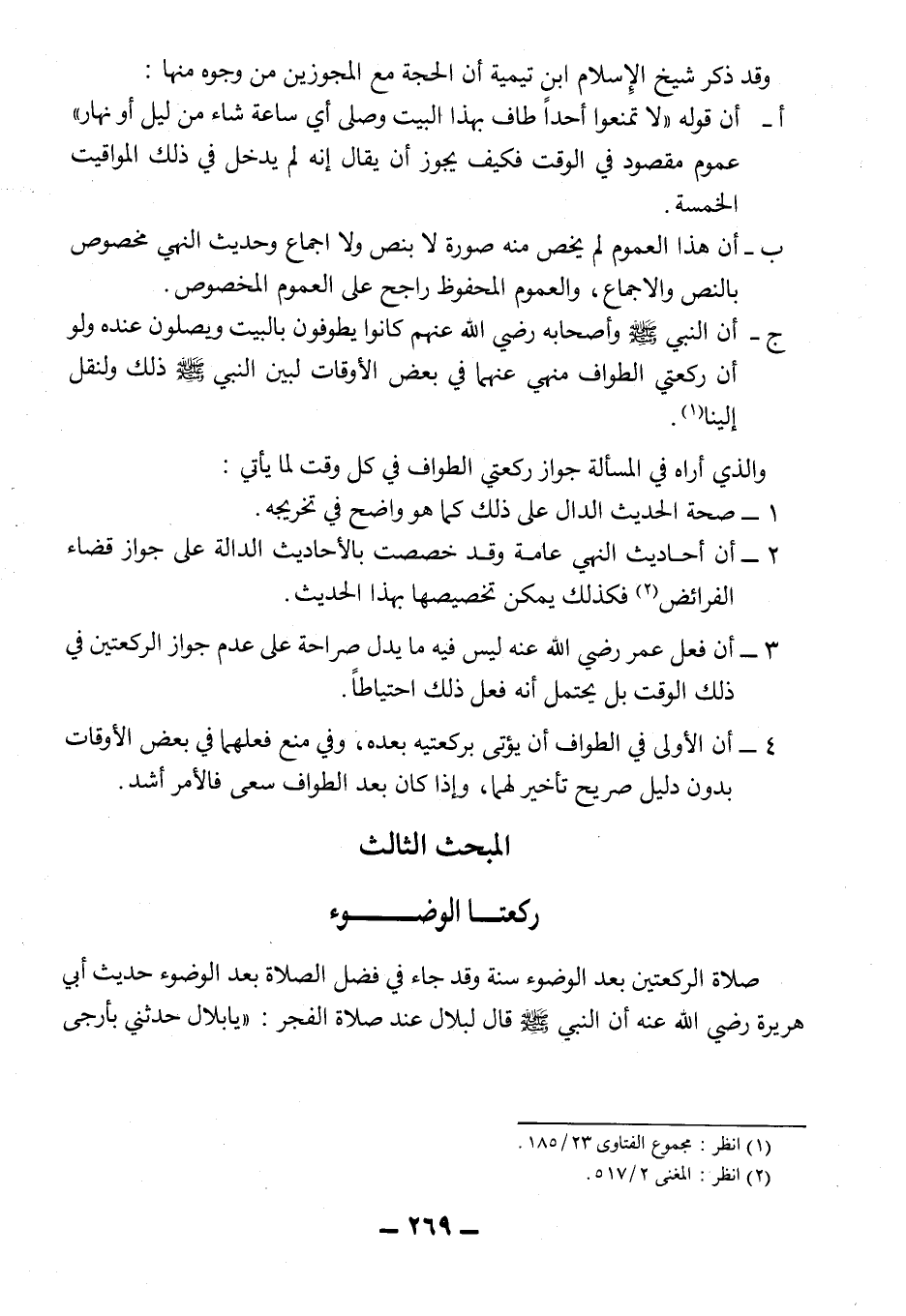ج- أن النبي نسميه وأصحابه رضي الله عنهم كانوا يطوفون بالبيت ويصلون عنده ولو أن ركعتي الطواف منهي عنهما في بعض الأوقات لبين النبي كبيه ذلك ولنقل إلينا1.