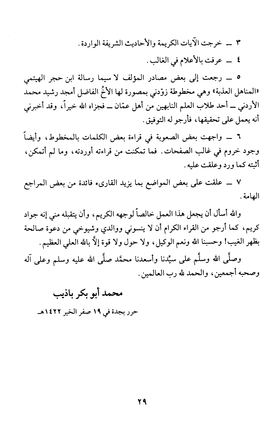 5 - رجعت إلى بعض مصادر المؤلف لا سيما رسالة ابن حجر الهيتمي "المناهل العذبة" وهي مخطوطة زوّدني بمصورة لها الأخُ الفاضل أمجد رشيد محمَّد الأردني -أحد طلاب العلم النابهين من أهل عمّان- فجزاه الله خيرًا، وقد أخبرني أنه يعمل على تحقيقها، فأرجو له التوفيق.