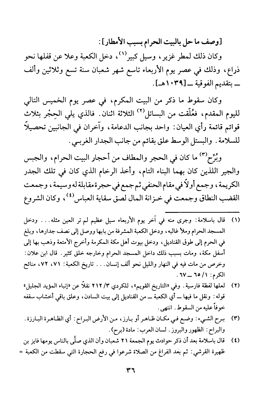 وكان ذلك لمطر غزير، وسيل كبير (¬1)، دخل الكعبة وعلا عن قفلها نحو ذراع، وذلك في عصر يوم الأربعاء تاسع شهر شعبان سنة تسع وثلاثين وألف -بتقديم الفوقية -[1039 هـ].
