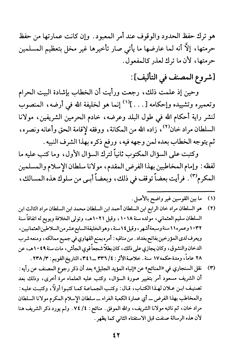 وحين إذ علمت ذلك، رجعت ورأيت أن الخطاب بإشادة البيت الحرام وتعميره وتشييده وإحكامه [...] (¬1) إنما هو لخليفة الله في أرضه، المنصوب لنشر راية أحكام الله في طول البلد وعرضه، خادم الحرمين الشريفين، مولانا السلطان مراد خان (¬2)، زاده الله من المكانة، ووفقه لإِقامة الحق وأعانه ونصره، ثم يتوجه الخطاب بعده لمن وجهه فيه، ورفع ذكره بهذا الشرف النبيه.