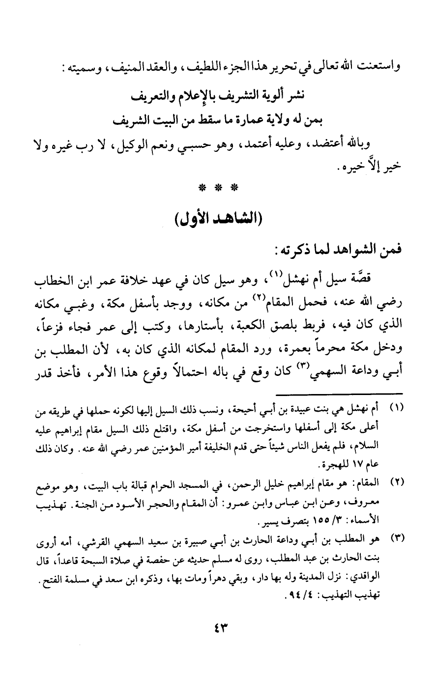 قصَّة سيل أم نهشل (¬1)، وهو سيل كان في عهد خلافة عمر ابن الخطاب رضي الله عنه، فحمل المقام (¬2) من مكانه، ووجد بأسفل مكة، وغبي مكانه الذي كان فيه، فربط بلصق الكعبة، بأستارها، وكتب إلى عمر فجاء فزعًا، ودخل مكة محرمًا بعمرة، ورد المقام لمكانه الذي كان به, لأن المطلب بن أبي وداعة السهمي (¬3) كان وقع في باله احتمالًا وقوع هذا الأمر، فأخذ قدر