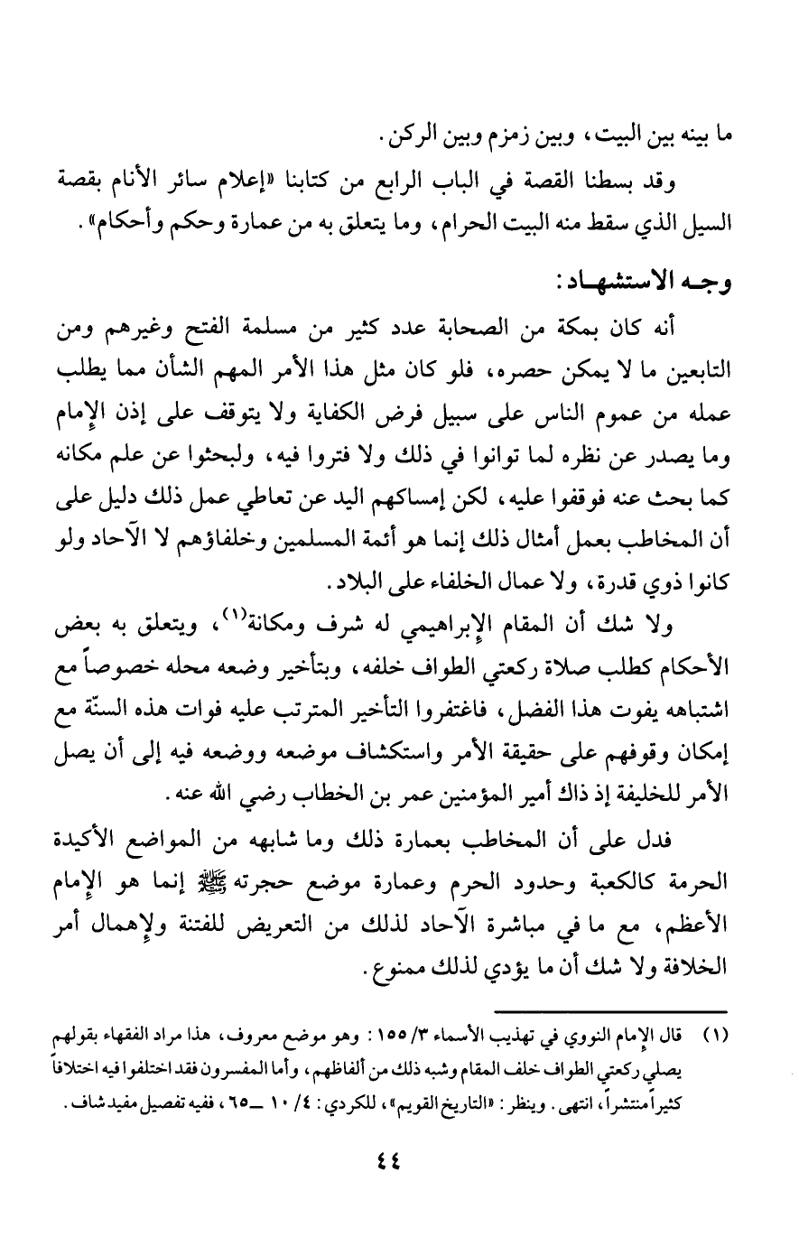 ولا شك أن المقام الإِبراهيمي له شرف ومكانة (¬1)، ويتعلق به بعض الأحكام كطلب صلاة ركعتي الطواف خلفه، وبتأخير وضعه محله خصوصًا مع اشتباهه يفوت هذا الفضل، فاغتفروا التأخير المترتب عليه فوات هذه السنّة مع إمكان وقوفهم على حقيقة الأمر واستكشاف موضعه ووضعه فيه إلى أن يصل الأمر للخليفة إذ ذاك أمير المؤمنين عمر بن الخطاب رضي الله عنه.