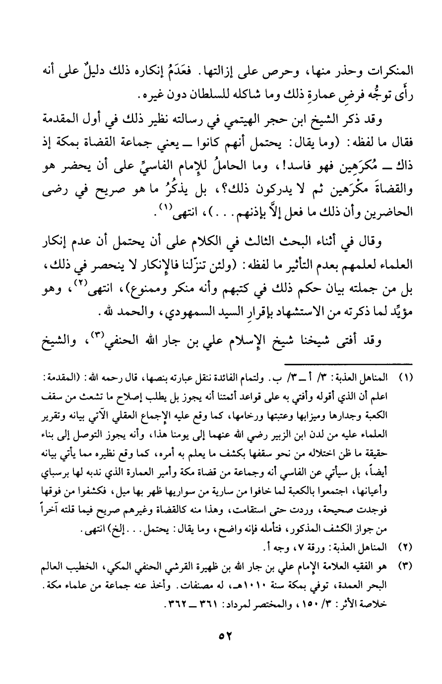 وقد ذكر الشيخ ابن حجر الهيتمي في رسالته نظير ذلك في أول المقدمة فقال ما لفظه: (وما يقال: يحتمل أنهم كانوا -يعني جماعة القضاة بمكة إذ ذاك- مُكرَهِين فهو فاسد!، وما الحاملُ للإِمام الفاسيّ على أن يحضر هو والقضاةَ مكْرَهين ثم لا يدركون ذلك؟، بل يذكُرُ ما هو صريح في رضي الحاضرين وأن ذلك ما فعل إلَّا بإذنهم ...)، انتهى (¬1).