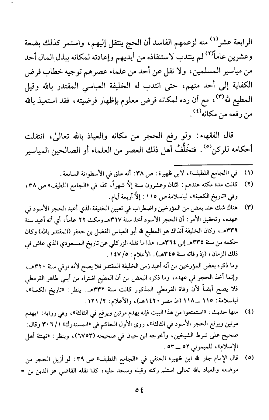 الرابعة عشر (¬1) منه لزعمهم الفاسد أن الحج ينتقل إليهم، واستمر كذلك بضعة وعشرين عامًا (¬2) لم ينتدب لاستنقاذه من أيديهم وإعادته لمكانه ببذل المال أحد من مياسير المسلمين، ولا نقل عن أحد من علماء عصرهم توجيه خطاب فرض الكفاية إلى أحد منهم، حتى انتدب له الخليفة العباسي المقتدر بالله وقيل المطيع لله (¬3)، مع أن رده لمكانه فرض معلوم بإظهار فرضيته، فقد استعيذ بالله من رفعه من مكانه (¬4).