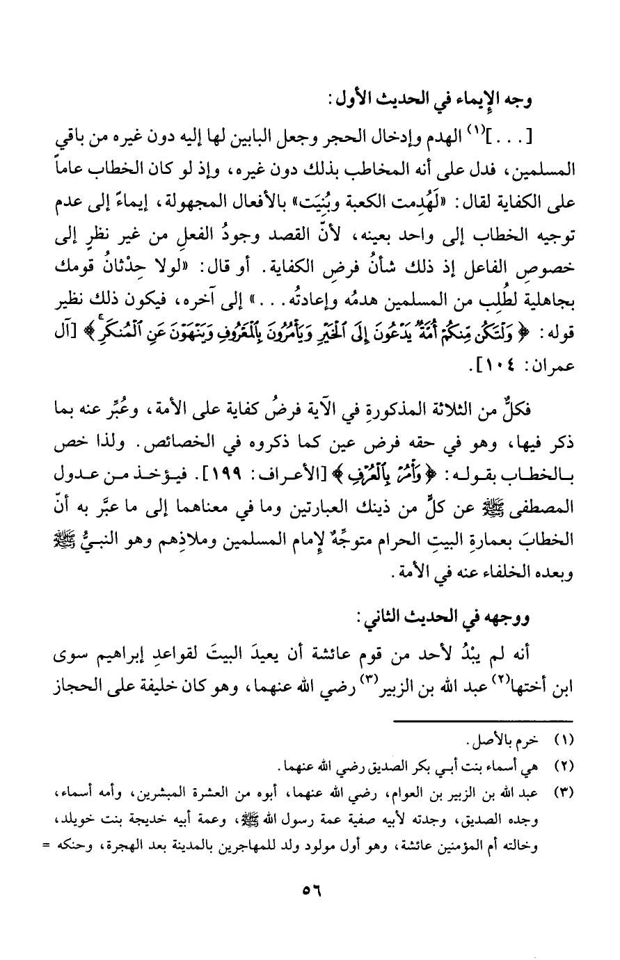 [...] (¬1) الهدم وإدخال الحجر وجعل البابين لها إليه دون غيره من باقي المسلمين، فدل على أنه المخاطب بذلك دون غيره، وإذ لو كان الخطاب عامًّا على الكفاية لقال: "لَهُدِمت الكعبة وبُنِيَت" بالأفعال المجهولة، إيماءً إلى عدم توجيه الخطاب إلى واحد بعينه, لأنَّ القصد وجودُ الفعلِ من غير نظرٍ إلى خصوصِ الفاعل إذ ذلك شأنُ فرضِ الكفاية. أو قال: "لولا حِدْثانُ قومك بجاهلية لطُلِب من المسلمين هدمُه وإعادتُه ... " إلى آخره، فيكون ذلك نظير قوله: {وَلْتَكُنْ مِنْكُمْ أُمَّةٌ يَدْعُونَ إِلَى الْخَيْرِ وَيَأْمُرُونَ بِالْمَعْرُوفِ وَيَنْهَوْنَ عَنِ الْمُنْكَرِ} [آل عمران: 104].