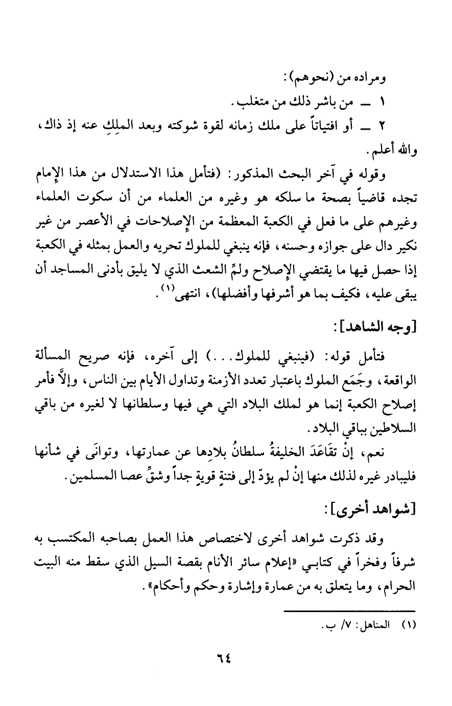 وقوله في آخر البحث المذكور: (فتأمل هذا الاستدلال من هذا الإِمام تجده قاضيًا بصحة ما سلكه هو وغيره من العلماء من أن سكوت العلماء وغيرهم على ما فعل في الكعبة المعظمة من الإِصلاحات في الأعصر من غير نكير دال على جوازه وحسنه، فإنه ينبغي للملوك تحريه والعمل بمثله في الكعبة إذا حصل فيها ما يقتضي الإِصلاح ولمِّ الشعث الذي لا يليق بأدنى المساجد أن يبقى عليه، فكيف بما هو أشرفها وأفضلها)، انتهى (¬1).