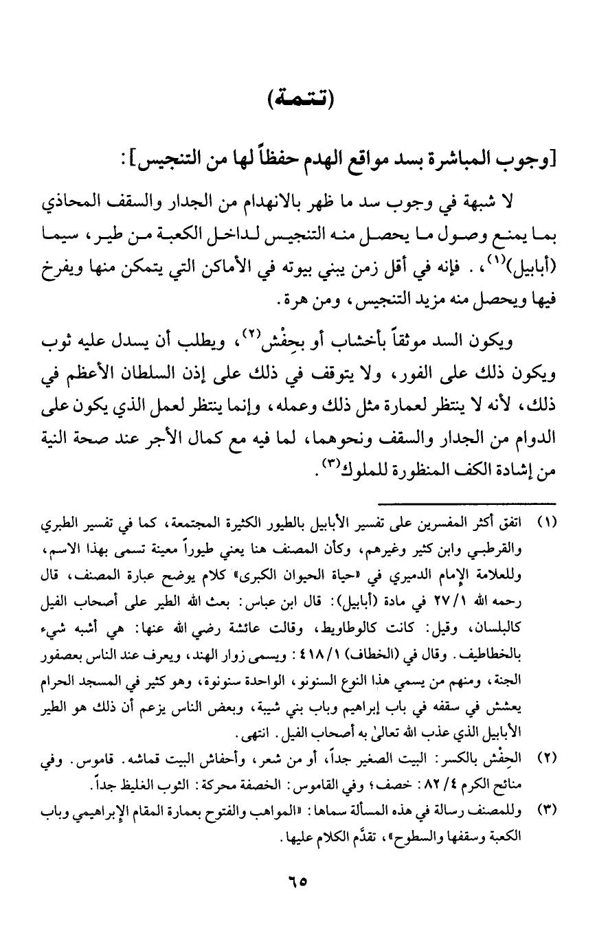 (¬3) وللمصنف رسالة في هذه المسألة سماها: "المواهب والفتوح بعمارة المقام الإِبراهيمي وباب الكعبة وسقفها والسطوح"، تقدَّم الكلام عليها.
