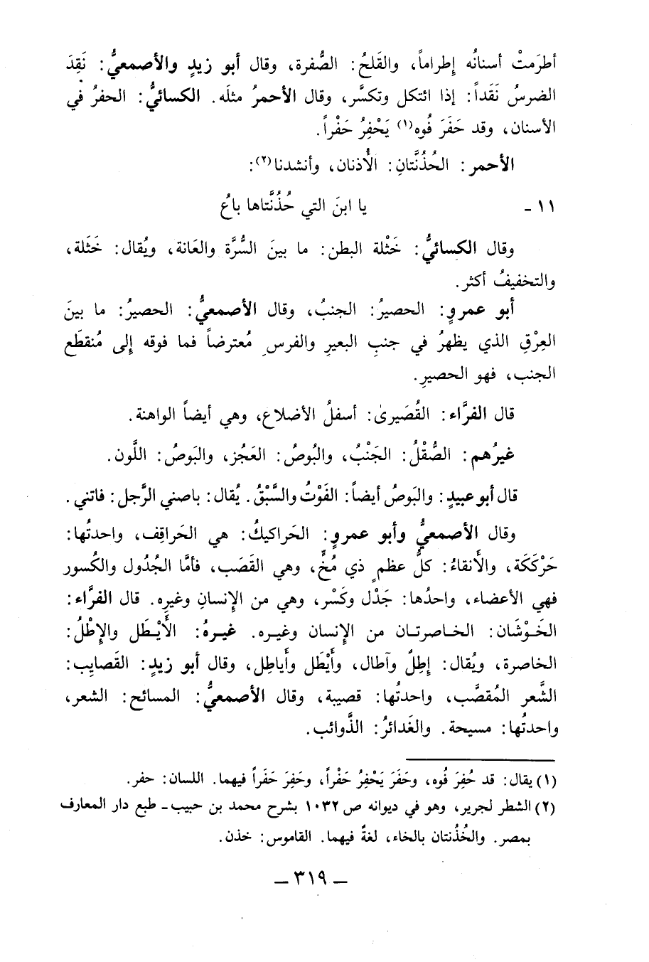 وقال الأصمعىُّ وأبو عمروٍ: الحَراكيكُ: هي الحَراقِف، واحدتُها: حَرْكَكَة، والأنقاءُ: كلّ عظمٍ ذي مُخٍّ، وهي القَصَب، فأمّا الجُدُول والكُسور فهي الأعضاء، واحدُها: جَدْل وكَسْر، وهي من الإنسانِ وغيرِه. قال الفرَّاء: الخَوْشَان: الخاصرتان من الإِنسان وغيره. غيرهُ: الأيْطَل والإطْلُ: الخاصرة، وُيقال: إِطِلٌ وآطال، وأيْطَل وأياطل، وقال أبو زيدٍ: القَصايِب: الشَّعر المُقصَّب، واحدتُها: قصيبة، وقال الأصمعيُّ: المسائح: الشعر، واحدتُها: مسيحة. والغَدائرُ: الذَّوائب.