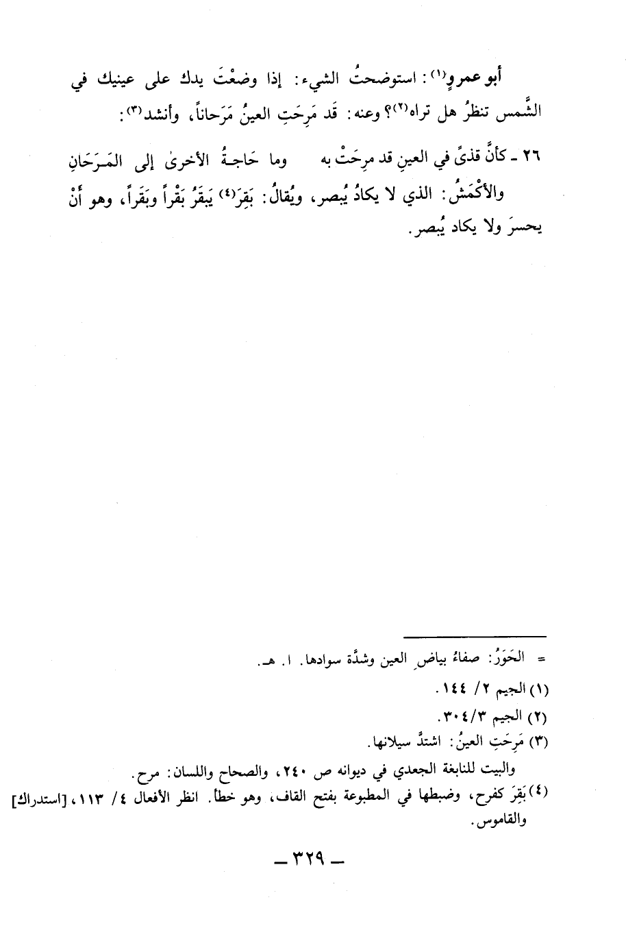 أبو عمرو1: استوضحت الشيء: إذا وضعْتَ يدك على عينيك في الشَّمس تنظرُ هل تراه 2؟ وعنه: قَد مَرِحتُ العينُ مَرَحاناً، وأنشد3: