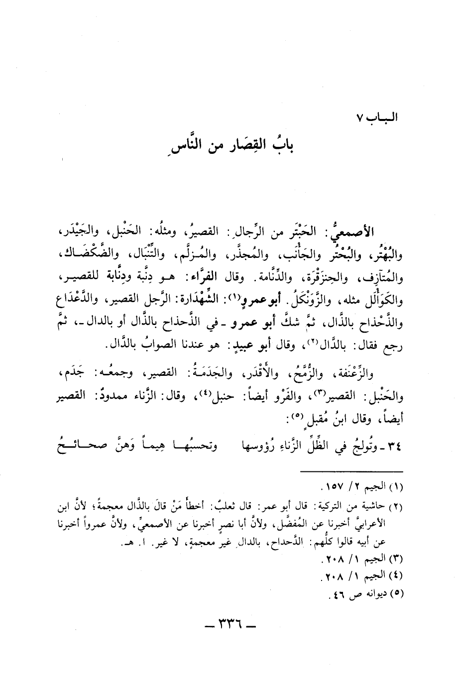 الأصمعيُّ: الحَبْتَر من الرِّجالِ: القصيرُ، ومثلُه: الحَنْبل، والجَيْدَر، والبُهْتُر، والبُحْتُر والجأنَب، والمُجذَّر، والمُزلَّم، والتِّنْبَال، والضَّكْضَاك، والمُتآزِف، والحِنزَقْرَة، والدِّنَّامة. وقال الفرَّاء: هو دِنَّبة ودِنَّابة للقصير، والكَوألَل مثله، والزَّوَنْكَلُ. أبو عمروٍ1: الشِّهْدَارة: الرَّجل القصير، والدَّعْدَاع والذَّحْذاح بالذَّال، ثمَّ شكَّ أبو عمرو- في الذَّحذاح بالذَّال أو بالدال-، ثمَّ رجع فقال: بالدَّال2، وقال أبو عبيدٍ: هو عندنا الصوابُ بالدَّال.