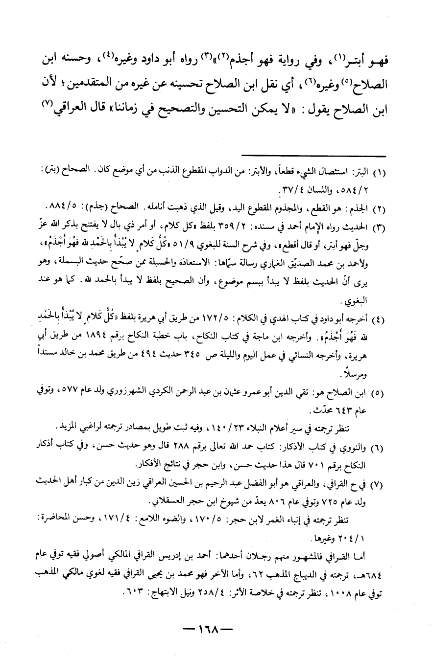 فَهُوَ "أَبتر"1، وَفِي رِوَايَة فَهُوَ "أَجْذم2"3 رَوَاهُ أَبُو دَاوُد وَغَيره4، وَحسنه ابْن الصّلاح5 وَغَيره6، أَي نقل ابْن الصّلاح تحسينه عَن غَيره من الْمُتَقَدِّمين؛ لِأَن ابْن الصّلاح يَقُول: "لَا يُمكن التحسين والتصحيح فِي زَمَاننَا" قَالَ الْعِرَاقِيّ7