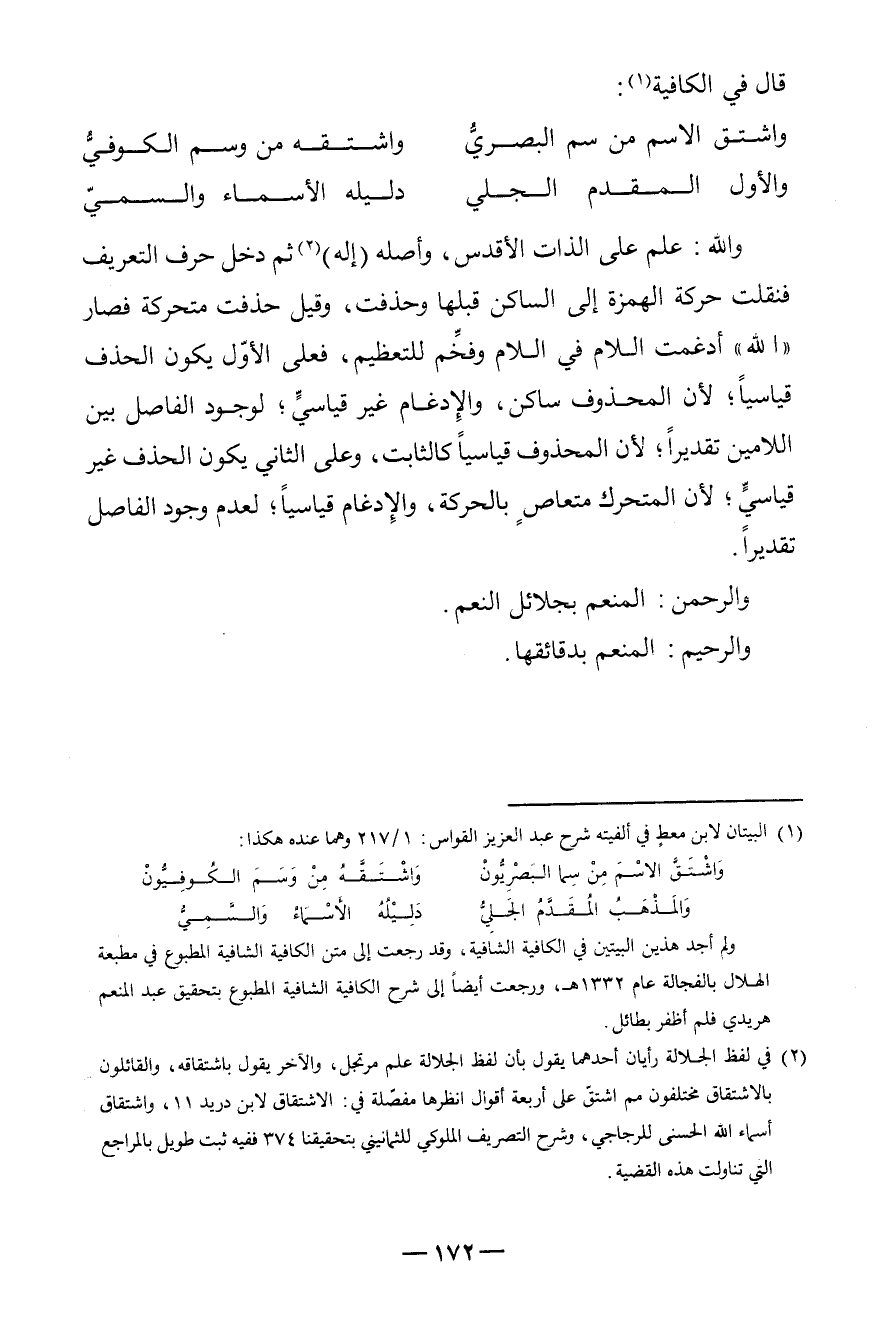 2 - فِي لفظ الْجَلالَة رأيان أَحدهمَا يَقُول بِأَن لفظ الْجَلالَة علم مرتجل، وَالْآخر يَقُول باشتقاقه، والقائلون بالاشتقاق مُخْتَلفُونَ مِم اشتقّ على أَرْبَعَة أَقْوَال أنظرها مفصلة فِي: الِاشْتِقَاق لِابْنِ دُرَيْد 11، واشتقاق أَسمَاء الله الْحسنى للزجاجي، وَشرح التصريف الملوكي للثمانيني بتحقيقنا 374 فَفِيهِ ثَبت طَوِيل بالمراجع الَّتِي تناولت هَذِه الْقَضِيَّة.