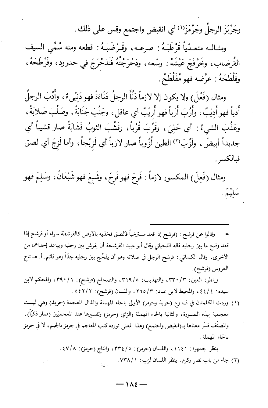 1 - وَردت الكلمتان فِي ف وح (حربذ وحرمز) الأولى بِالْحَاء الْمُهْملَة والذال الْمُعْجَمَة (حربذ) وَهِي لَيست معجمية بِهَذِهِ الصُّورَة، وَالثَّانيَِة بِالْحَاء الْمُهْملَة وَالزَّاي (حرمز) وتفسيرها عِنْد المعجميّين (صَار ذكيّاً) ، والمصنّف فسّر مَعْنَاهَا بـ (انقبض وَاجْتمعَ) وَهَذَا الْمَعْنى تورده كتب المعاجم فِي جرمز بِالْجِيم، لَا فِي حرمز بِالْحَاء الْمُهْملَة.