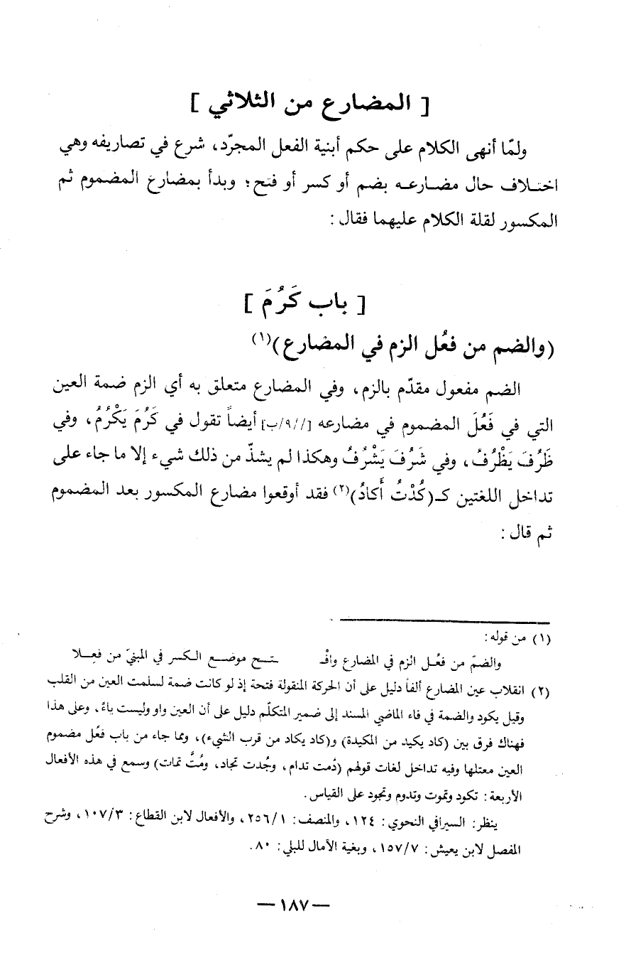 الضَّم مفعول مقدّم بـ (الزم) ، و (فِي الْمُضَارع) مُتَعَلق بِهِ أَي الزم ضمة الْعين الَّتِي فِي فَعُلَ المضموم فِي مضارعه [9، ب] أيضاَ تَقول فِي كَرُمَ يَكْرُمُ، وَفِي ظَرُفَ يَظْرُفُ، وَفِي شَرُفَ يَشْرُفُ وَهَكَذَا لم يشذّ من ذَلِك شَيْء إِلَّا مَا جَاءَ على تدَاخل اللغتين ? (كُدْتُ أَكَادُ) 2 فقد أوقعوا مضارع المكسور بعد المضموم ثمَّ قَالَ: