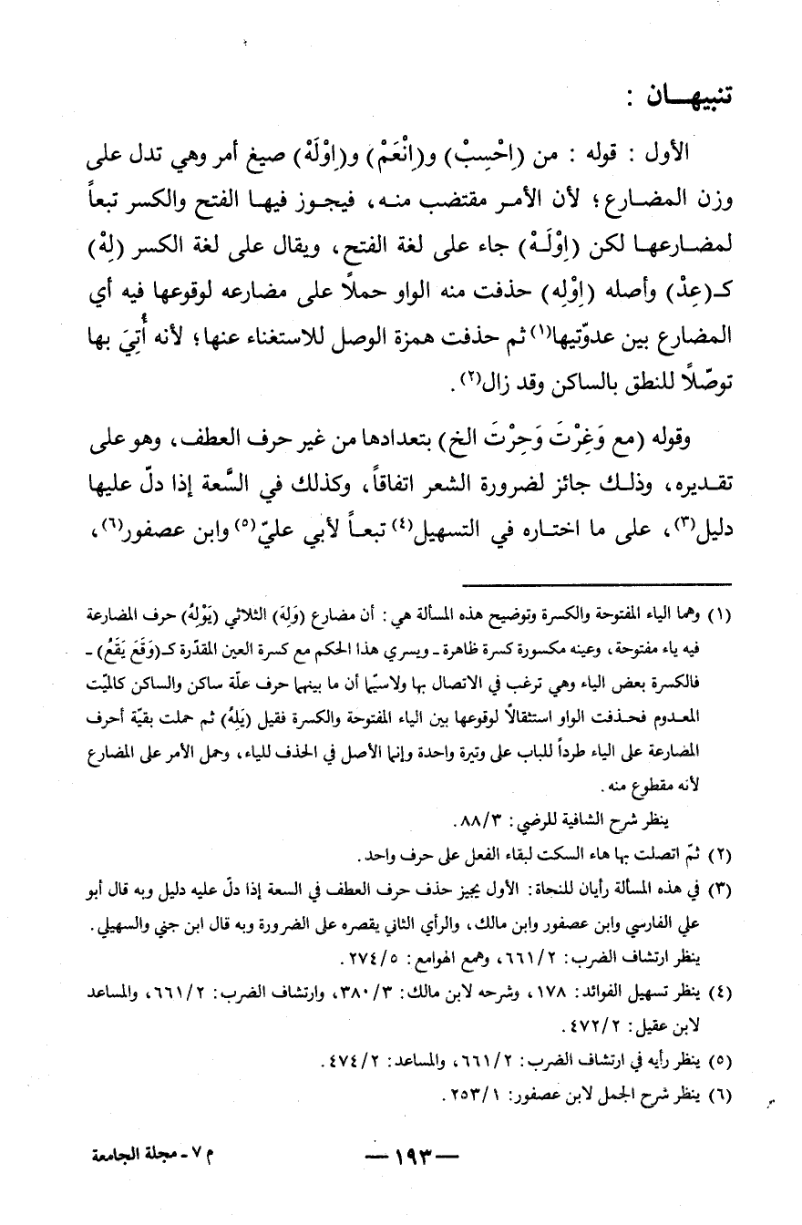 الأول: قَوْله: من (اِحْسِبْ) و (اِنْعَمْ) و (اِوْلَهْ) صِيغ أَمر وَهِي تدل على وزن الْمُضَارع؛ لِأَن الْأَمر مقتضب مِنْهُ، فَيجوز فِيهَا الْفَتْح وَالْكَسْر تبعا لمضارعها لَكِن (اِوْلَهْ) جَاءَ على لُغَة الْفَتْح، وَيُقَال على لُغَة الْكسر (لِهْ) و (عِدْ) وَأَصله (اِوْلِه) حذفت مِنْهُ الْوَاو حملا على مضارعه لوقوعها فِيهِ أَي الْمُضَارع بَين عدوّتيها1 ثمَّ حذفت همزَة الْوَصْل للاستغناء عَنْهَا؛ لِأَنَّهُ أُتِيَ بهَا توصّلا للنطق بالساكن وَقد زَالَ2.
