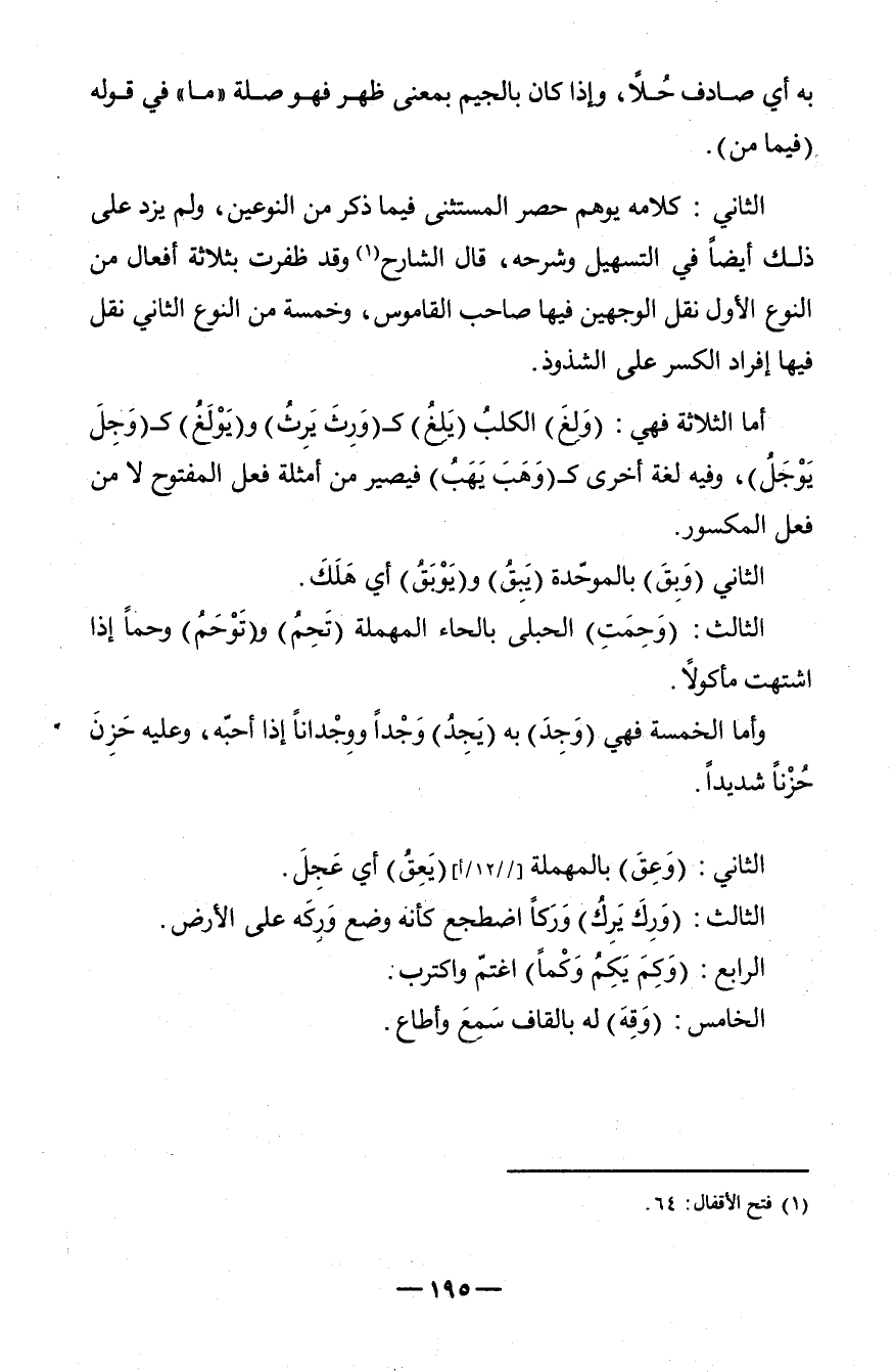 الثَّانِي: كَلَامه يُوهم حصر الْمُسْتَثْنى فِيمَا ذكر من النَّوْعَيْنِ، وَلم يزدْ على ذَلِك أَيْضا فِي التسهيل وَشَرحه، قَالَ الشَّارِح1 وَقد ظَفرت بِثَلَاثَة أَفعَال من النَّوْع الأول نقل الْوَجْهَيْنِ فِيهَا صَاحب الْقَامُوس، وَخَمْسَة من النَّوْع الثَّانِي نقل فِيهَا إِفْرَاد الْكسر على الشذوذ.