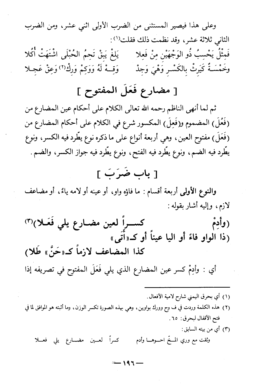 ثمَّ لما أنهى النَّاظِم رَحمَه الله تَعَالَى الْكَلَام على أَحْكَام عين الْمُضَارع من (فَعُلَ) المضموم و (فَعِلَ) المكسور شرع فِي الْكَلَام على أَحْكَام الْمُضَارع من (فَعَلَ) مَفْتُوح الْعين، وَهِي أَرْبَعَة أَنْوَاع على مَا ذكره نوع يطّرد فِيهِ الْكسر، وَنَوع يطّرد فِيهِ الضَّم، وَنَوع يطّرد فِيهِ الْفَتْح، وَنَوع يطّرد فِيهِ جَوَاز الْكسر، وَالضَّم.
