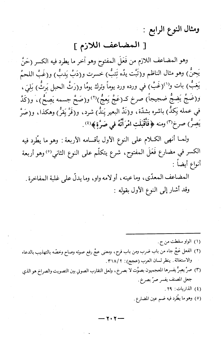 وَهُوَ المضاعف اللَّازِم من فَعَلَ المفتوح وَهُوَ آخر مَا يطرد فِيهِ الْكسر (حَنَّ يَحِنُّ) وَهُوَ مِثَال النَّاظِم و (تَبَّت يدُه تَتِبُّ) خسرت و (دَبَّ يَدِبُّ) و (غَبَّ اللحمُ يَغِبُّ) بَات و (غَبَّ) فِي ورده ورد يَوْمًا وَترك يَوْمًا و (رَثَّ الْحَبل يَرِثُّ) بَلِيَ، و (ضَجَّ يَضِجُّ ضَجِيجًا) صرخَ ? (عَجَّ يَعِجُّ) 2 و (صَحَّ جِسْمه يَصِحُّ) ، و (كَدَّ فِي عمله يَكِدُّ) بَاشرهُ بشدّة، و (نَدَّ الْبَعِير يَنِدُّ) شرد، و (قَرَّ يَقِرُّ) وَهَكَذَا، و (صَرَّ يَصِرُّ) صرخَ3 وَمِنْه {فَأَقْبَلَتِ امْرَأَتُهُ فِي صَرَّةٍ} 4.