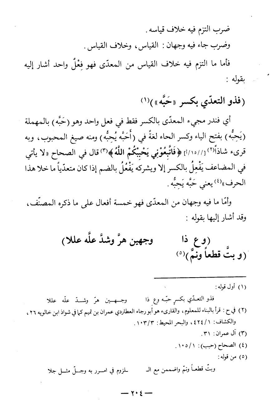 أَي فندر مَجِيء المعدّى بِالْكَسْرِ فَقَط فِي فعل وَاحِد وَهُوَ (حَبَّه) بِالْمُهْمَلَةِ (يَحِبُّه) بِفَتْح الْيَاء وَكسر الْحَاء لُغَة فِي (أَحَبَّه يُحِبُّه) وَمِنْه صِيغ المحبوب، وَبِه قرئَ شاذاً2 [15/أ] {فَاتَّبِعُونِي يُحْبِبْكُمُ اللَّهُ} 3 قَالَ فِي الصِّحَاح: "لَا يَأْتِي فِي المضاعف يَفْعِلُ بِالْكَسْرِ إِلَّا ويشركه يَفْعُلُ بِالضَّمِّ إِذا كَانَ متعدّياً مَا خلا هَذَا الْحَرْف"4 يَعْنِي حَبَّه يَحِبُّه.