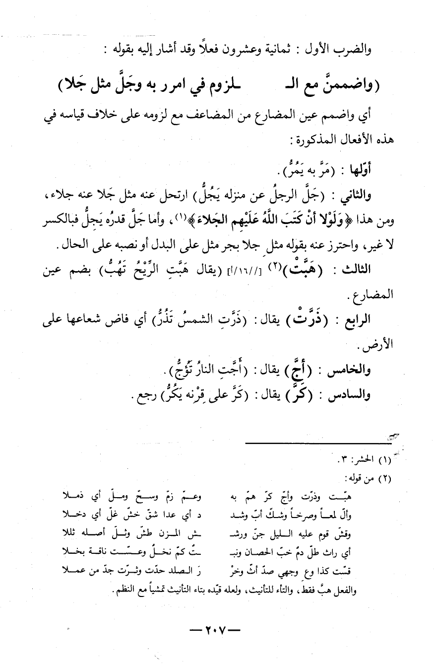 وَالثَّانِي: (جَلَّ الرجلُ عَن منزله يَجُلُّ) ارتحل عَنهُ مثل جَلا عَنهُ جلاء، وَمن هَذَا {وَلَوْلا أَنْ كَتَبَ اللَّهُ عَلَيْهِمُ الْجَلاءَ} 1، وَأما جَلَّ قدرُه يَجِلُّ فبالكسر لَا غير، وَاحْترز عَنهُ بقوله مثل جلا بجر مثل على الْبَدَل أَو نَصبه على الْحَال.