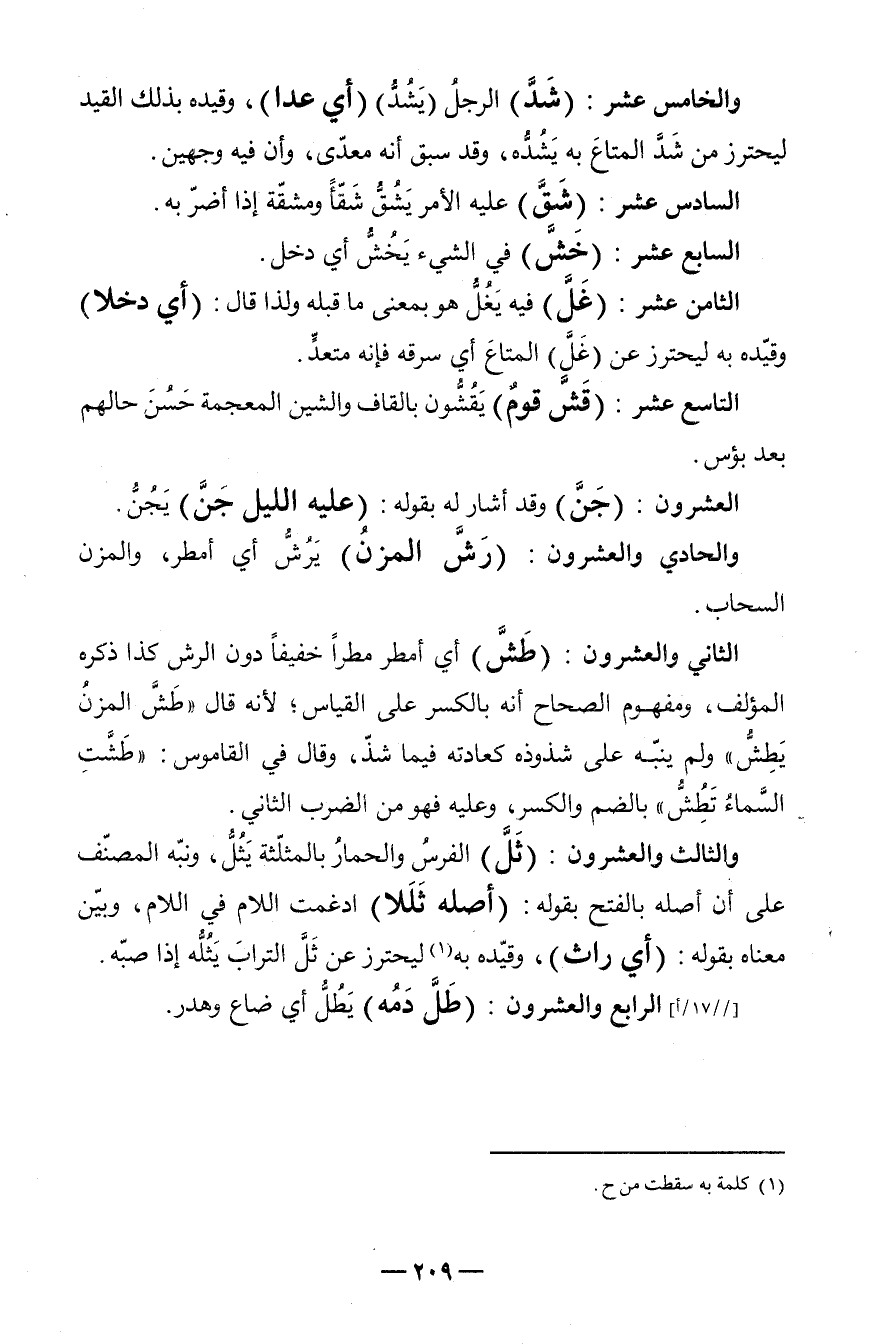 الثَّامِن عشر: (غَلَّ) فِيهِ يَغُلًّ هُوَ بِمَعْنى مَا قبله وَلذَا قَالَ: (أَي دخلا) وقيّده بِهِ ليحترز عَن (غَلَّ) المتاعَ أَي سَرقه فَإِنَّهُ متعدٍّ.