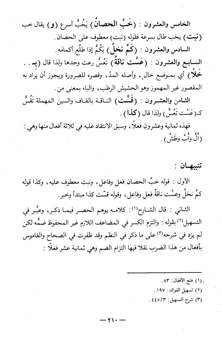 الثَّانِي: قَالَ الشَّارِح1: كَلَامه يُوهم الْحصْر فِيمَا ذكر، وعبَّر فِي التسهيل2 بقوله: وَالْتزم الْكسر فِي المضاعف اللَّازِم غير الْمَحْفُوظ ضمُّه لَكِن لم يزدْ فِي شَرحه3 على مَا ذكر فِي النّظم وَقد ظَفرت فِي الصِّحَاح والقاموس بِأَفْعَال من هَذَا الضَّرْب نقلا فِيهَا الْتِزَام الضَّم وَهِي ثَمَانِيَة عشر فعلا: