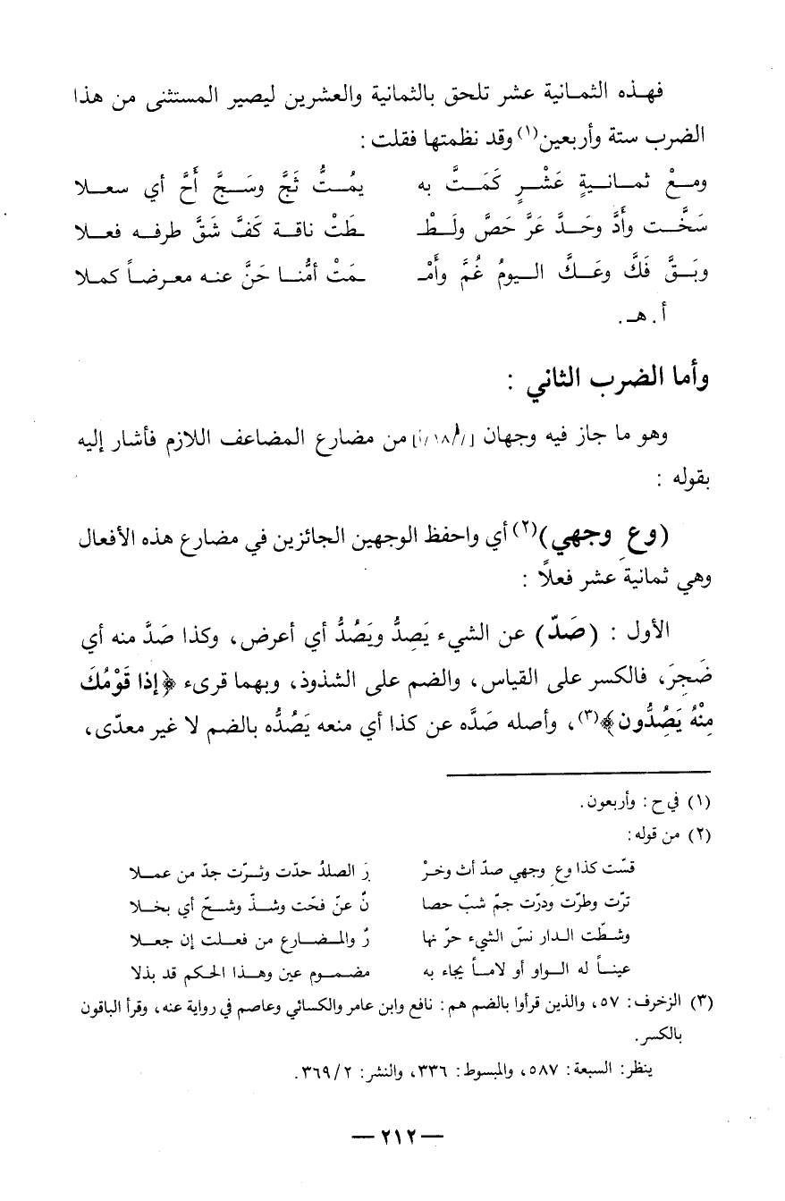 الأول: (صَدّ) عَن الشَّيْء يَصِدُّ ويَصُدًّ أَي أعرض، وَكَذَا صَدَّ مِنْهُ أَي ضَجِرَ، فالكسر على الْقيَاس، وَالضَّم على الشذوذ، وَبِهِمَا قرئَ {إِذَا قَوْمُكَ مِنْهُ يَصِدُّونَ} 3، وَأَصله صدّه عَن كَذَا أَي مَنعه يَصُدُّه بِالضَّمِّ لَا غير معدّى،