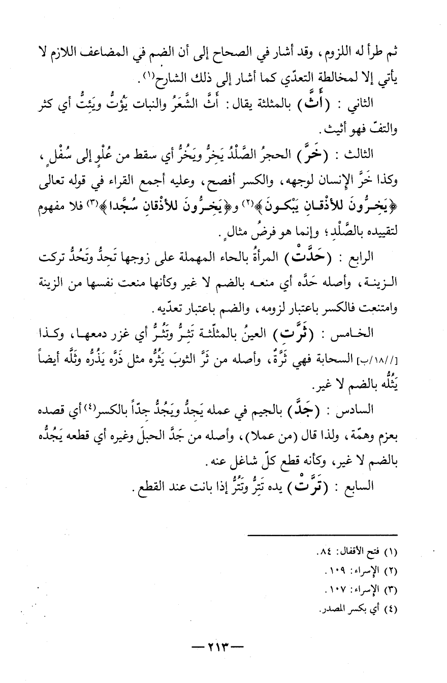 الثَّالِث: (خَرَّ) الحجرُ الصَّلْدُ يَخِرُّ ويَخُرُّ أَي سقط من علْوٍ إِلَى سُفْلٍ، وَكَذَا خَرَّ الإِنسان لوجهه، وَالْكَسْر أفْصح، وَعَلِيهِ أجمع الْقُرَّاء فِي قَوْله تَعَالَى: {يَخِرًّونَ للأذْقانِ يَبْكونَ} 2 {يَخِرُّونَ لِلأَذْقَانِ سُجَّداً} 3 فَلَا مَفْهُوم لتقييده بالصَّلْدِ؛ وَإِنَّمَا هُوَ فرضُ مثالٍ.