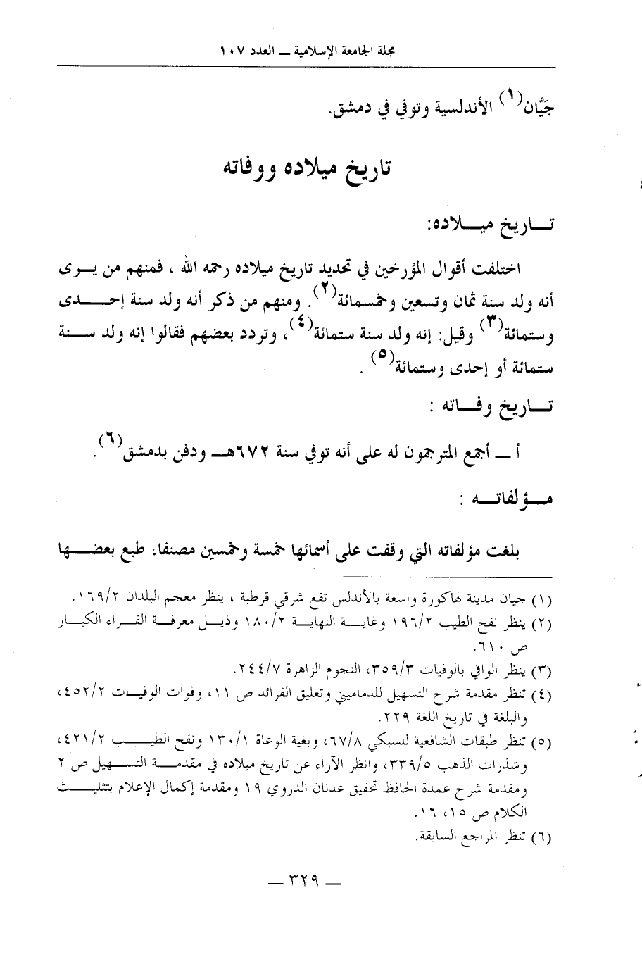 5 تنظر طَبَقَات الشَّافِعِيَّة للسبكي 8/67، وبغية الوعاة 1/130 ونفح الطّيب 2/421، وشذرات الذَّهَب 5/339، وَانْظُر الآراء عَن تَارِيخ ميلاده فِي مُقَدّمَة التسهيل ص 2 ومقدمة شرح عُمْدَة الْحَافِظ تَحْقِيق عدنان الدروي 19 ومقدمة إِكْمَال الْإِعْلَام بِتَثْلِيث الْكَلَام ص 15، 16.