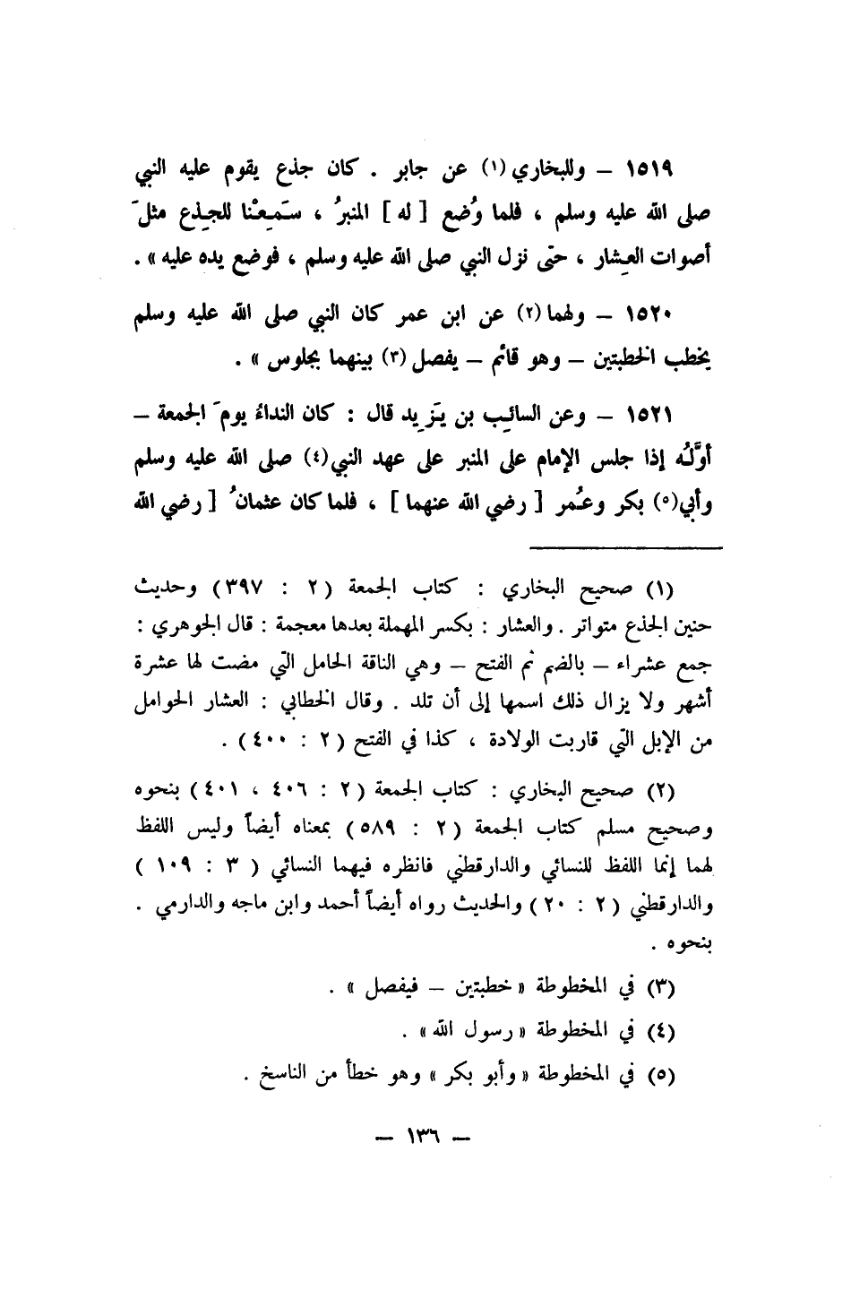 1521- وعن السائِب بن يَزِيد قال: "كان النداءُ يومَ الجمعة - أوَّلُه - إذا جلس الإمام على المنبر، على عهد النبي 4 صلى الله عليه وسلم وأبي 5 بكر وعُمر [رضي الله عنهما] . فلما كان عثمان [رضي الله