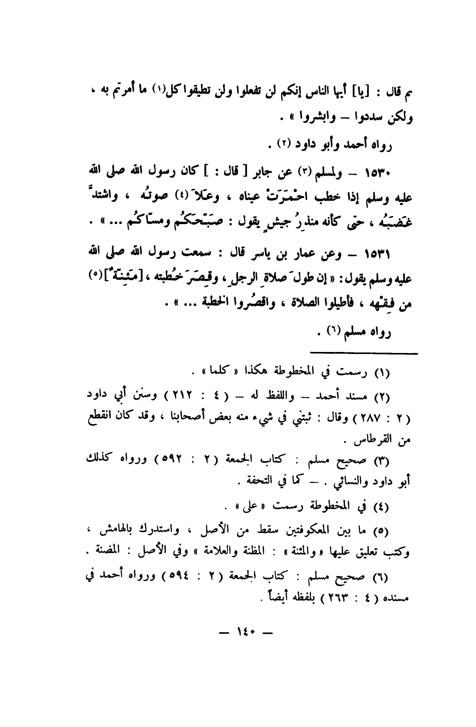 1531- وعن عمار بن ياسر قال: سمعت رسول الله صلى الله عليه وسلم يقول: "إن طولَ صلاةِ الرجلِ وقِصَرَ خُطبته، [مَئِنّةٌ] 5 من فِقْهه؛ فأطيلوا الصلاة، واقصروا الخطبة". رواه مسلم 6.