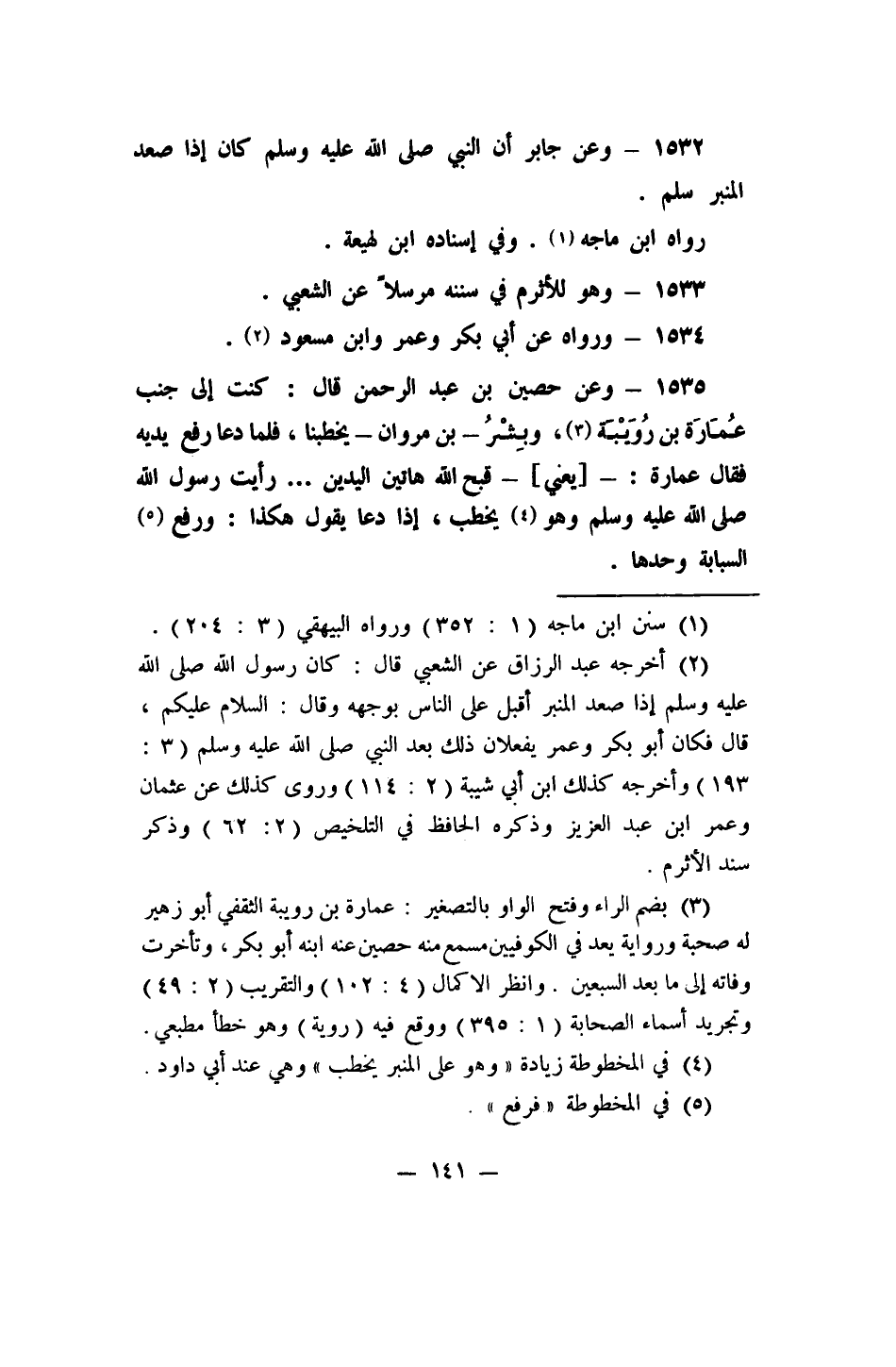 1535- وعن حصين بن عبد الرحمن قال: "كنت إلى جنب عُمَارَة بن رُوَيْبَة، 3 وبِشْرُ - بن مروان - يخطبنا، فلما دعا رفع يديه، فقال عمارة: -[يعني]-: قبح الله هاتين اليدين ... رأيت رسول الله صلى الله عليه وسلم وهو 4 يخطب، إذا دعا يقول هكذا: ورفع 5 السبابة وحدها".