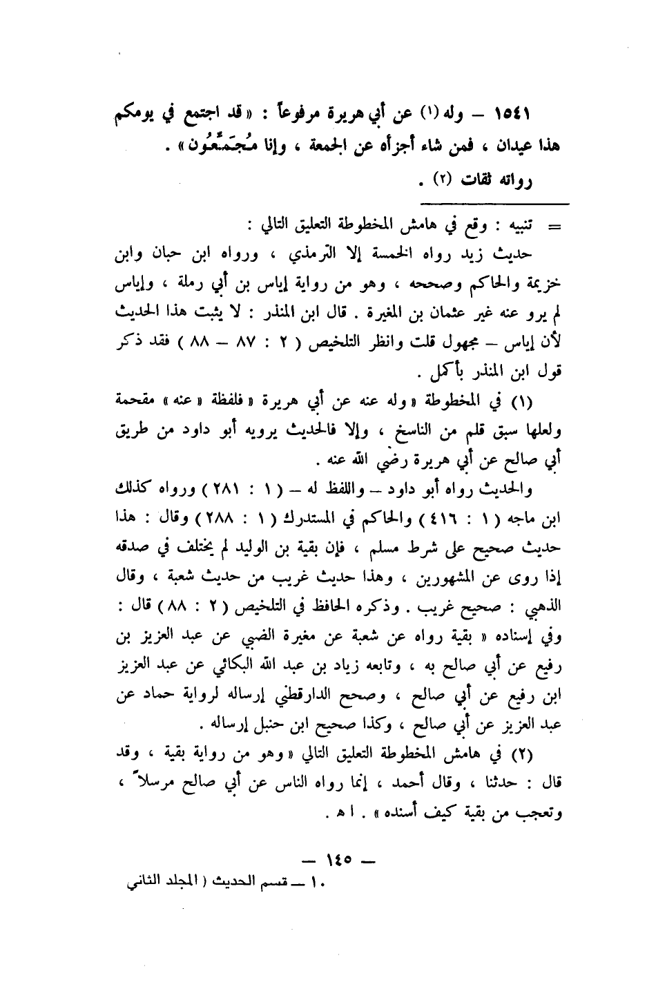 1541- وله 1 عن أبي هريرة، مرفوعاً: "قد اجتمع في يومكم هذا عيدان، فمن شاء أجزأه عن الجمعة، وإنا مجمعون". رواته ثقات 2.