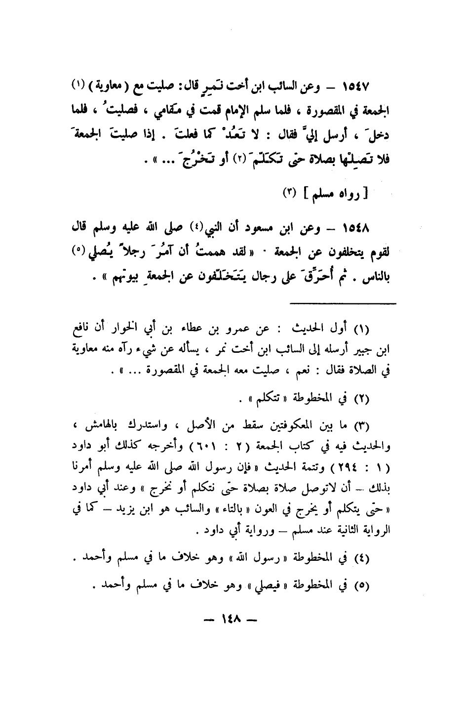 1547- وعن السائب ابن أخت نَمِرٍ قال: ?"صليت مع [معاوية] 1 الجمعة في المقصورة، فلما سلم الإمام قمت في مَقامي فصليتُ، فلما دخلَ، أرسل إليَّ فقال: لا تَعُدْ كما فعلتَ. إذا صليتَ الجمعة فلا تصِلْها بصلاة حتى تَكَلّمَ 2 أو تَخْرُجَ". [رواه مسلم] 3.