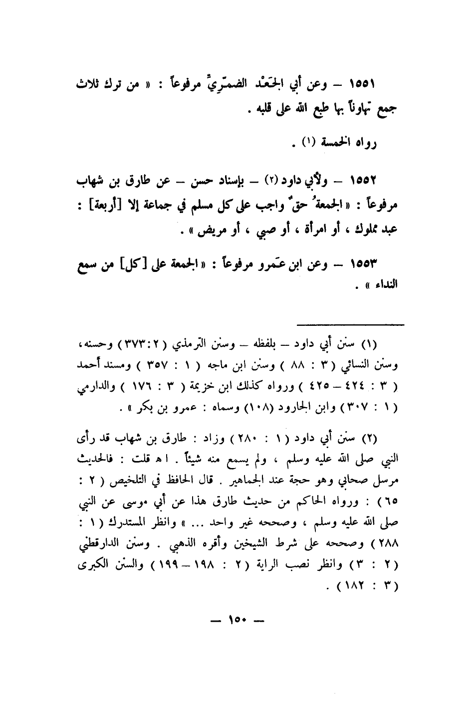1552- ولأبي داود 2 - بإسناد حسن - عن طارق بن شهاب، مرفوعاً: "الجمعةُ حقٌ واجب على كل مسلم في جماعة إلا [أربعة] : عبد مملوك، أو امرأة، أو صبي، أو مريض".